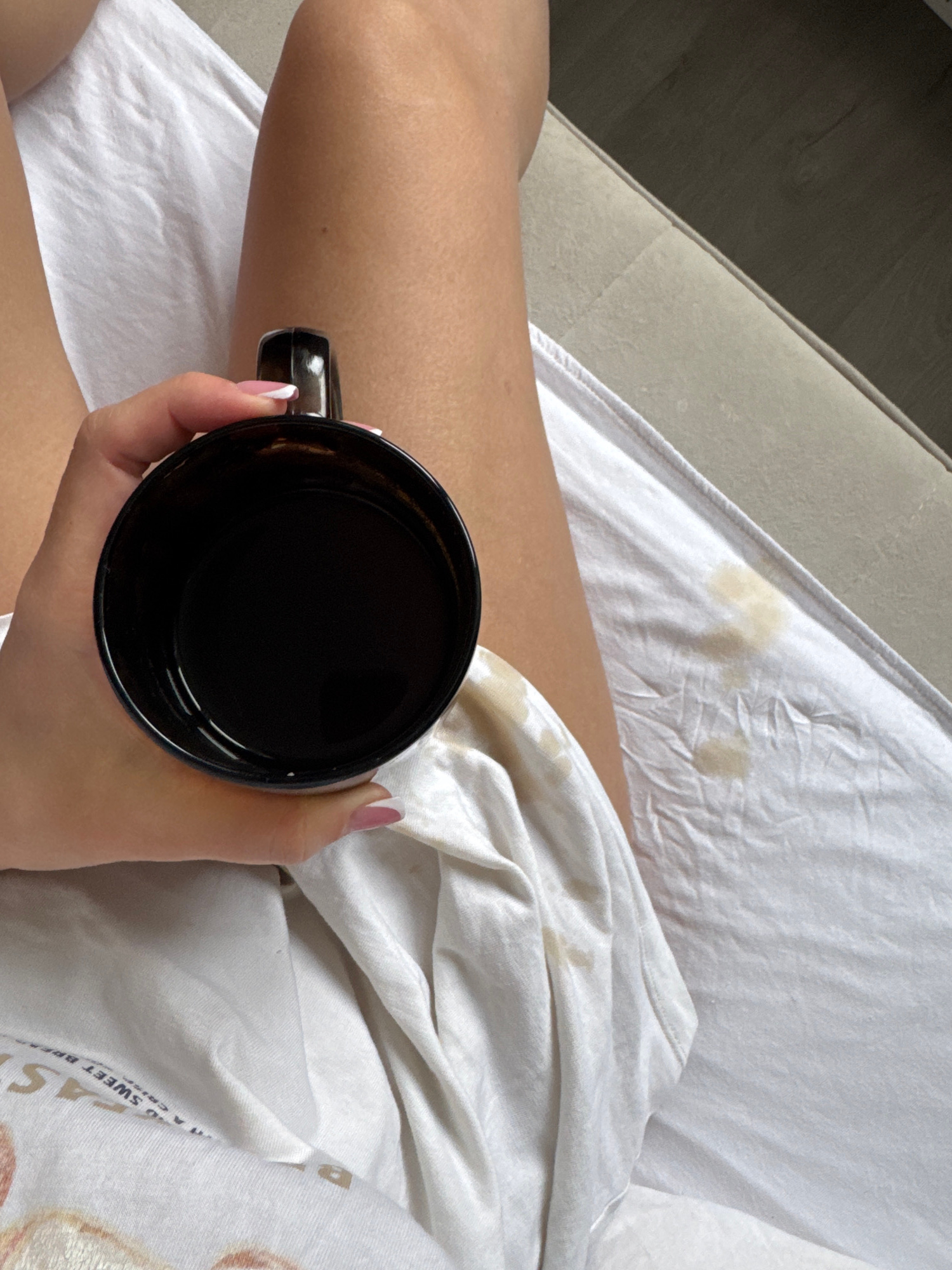 An indoor, overhead shot captures a person's leg and hand holding a black mug, seemingly filled with a dark liquid. The person's bare leg occupies the left and central-left portion of the frame, restiβ¦read more