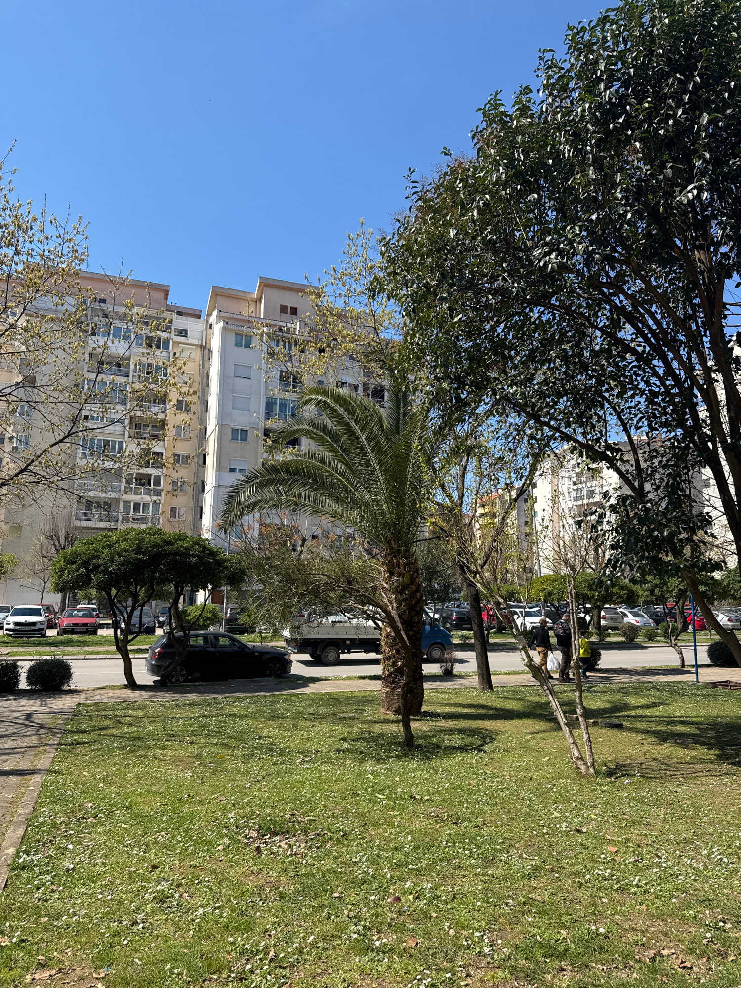 The image depicts an urban scene in Bar, Montenegro. A palm tree stands in a grassy area with white flowering ground cover. A multi-story building with numerous windows is visible in the background, p…read more