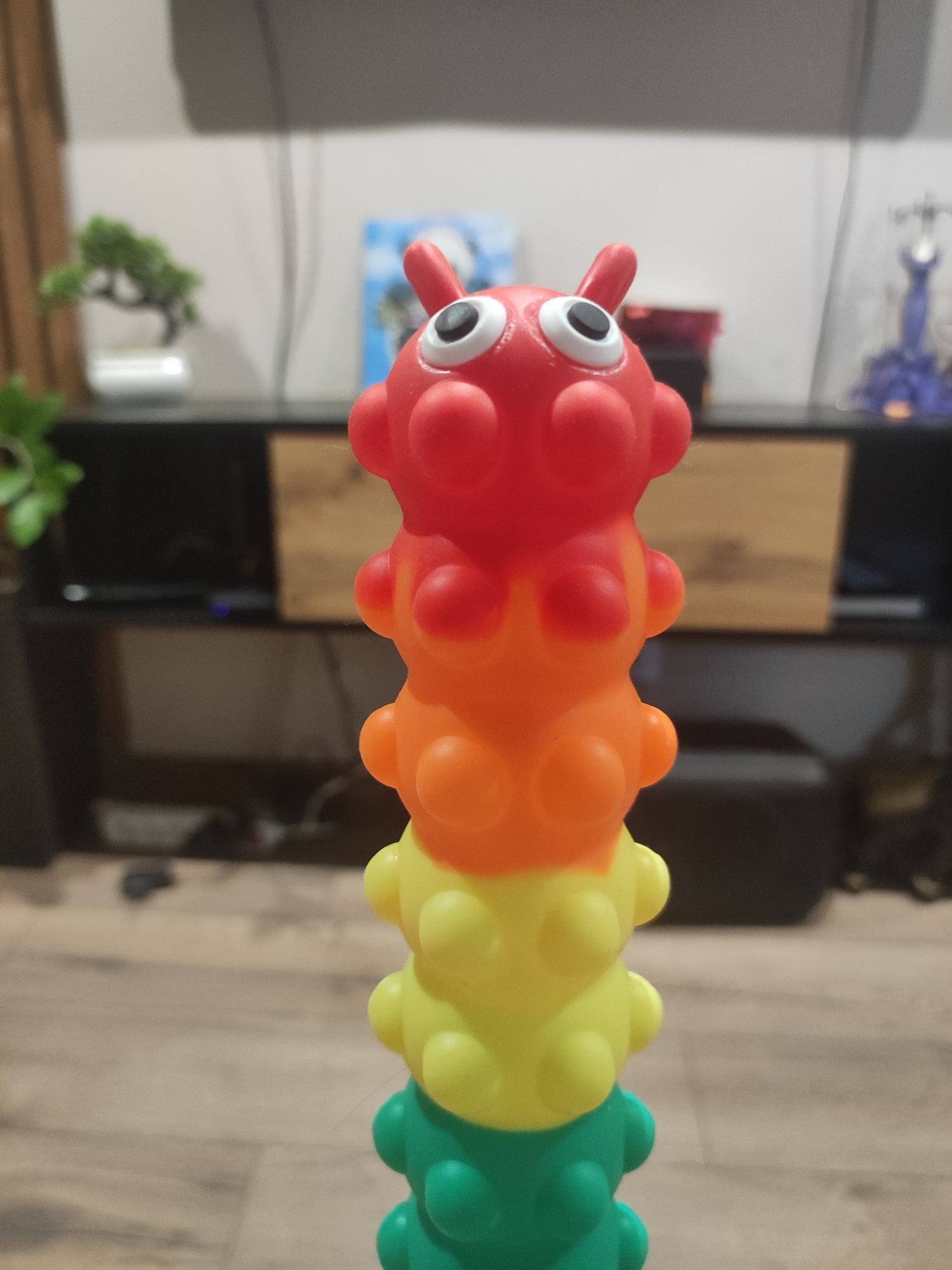 A close-up shot depicts a multi-colored toy caterpillar with large eyes, stacked in segments of red, orange, yellow, and green. The toy is positioned in the foreground, with a wooden floor beneath it.…read more