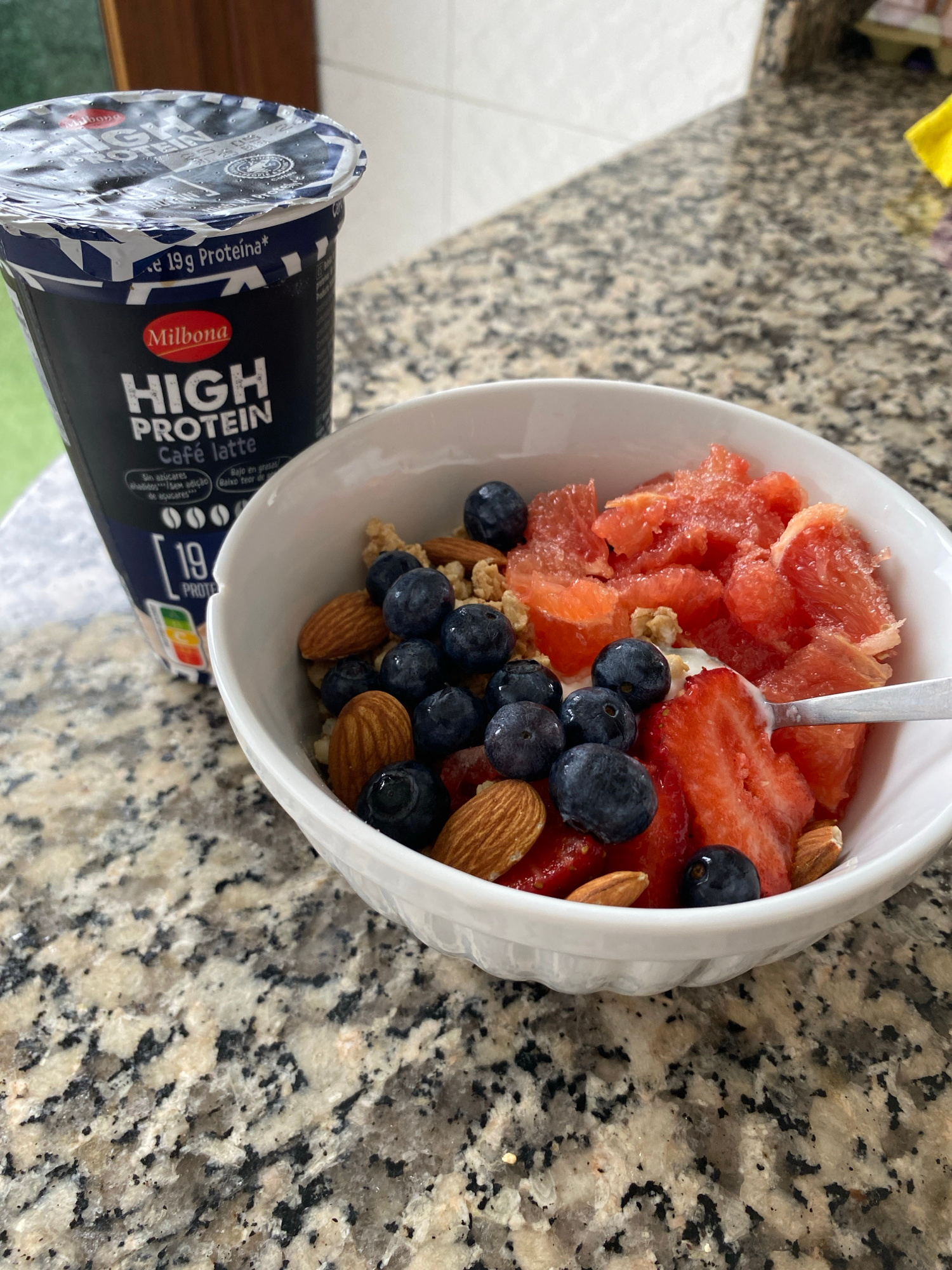 The image shows a bowl of fruit, nuts, and cereal on a granite countertop, next to a Milbona High Protein Café latte yogurt container. The bowl contains sliced strawberries, blueberries, grapefruit ch…read more