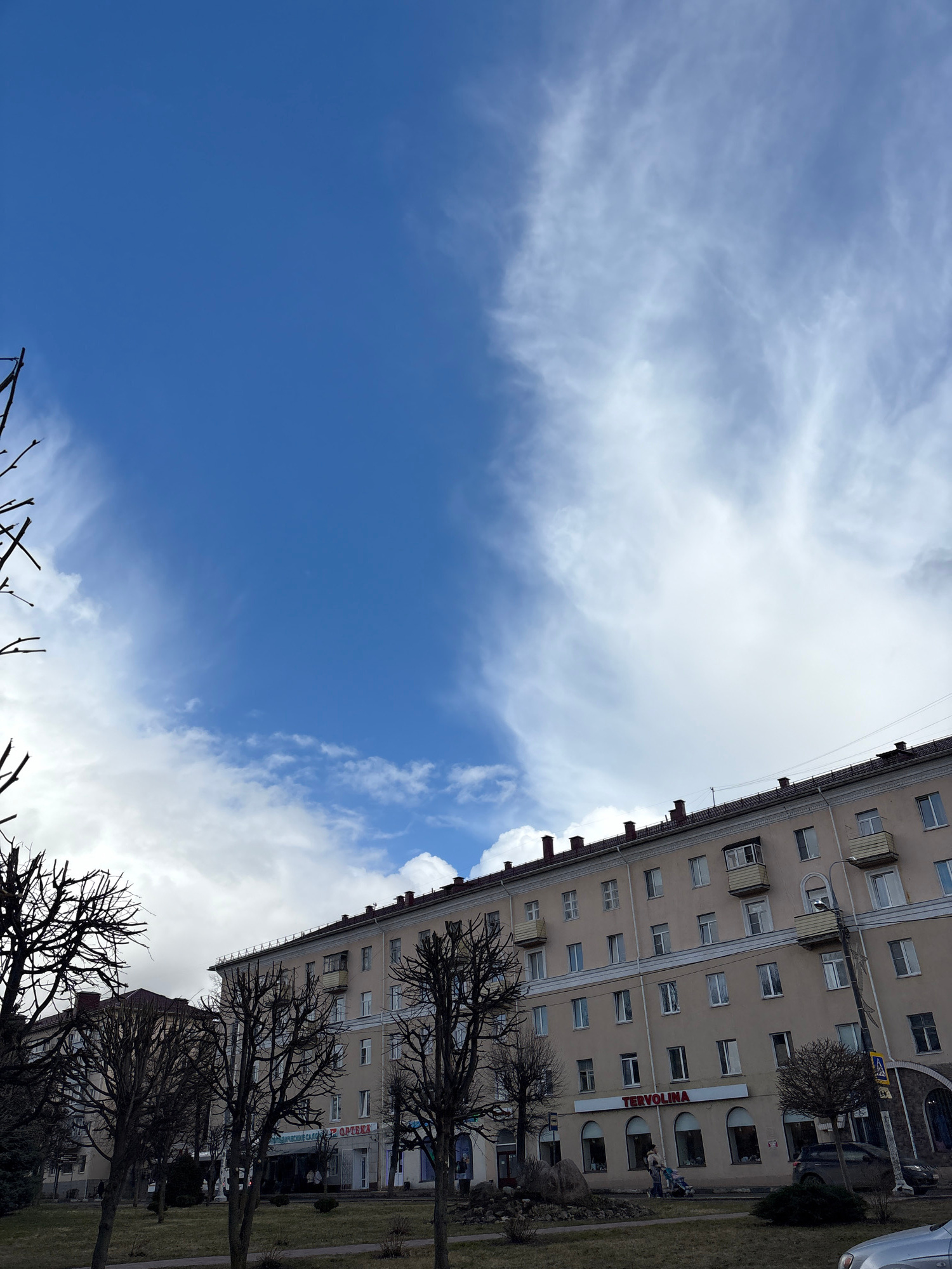 The image shows a view of a building in Klin, Russia. The building has a beige facade with multiple windows and balconies. A sign with the word "TERVOLINA" is visible on the building. Several bare tre…read more