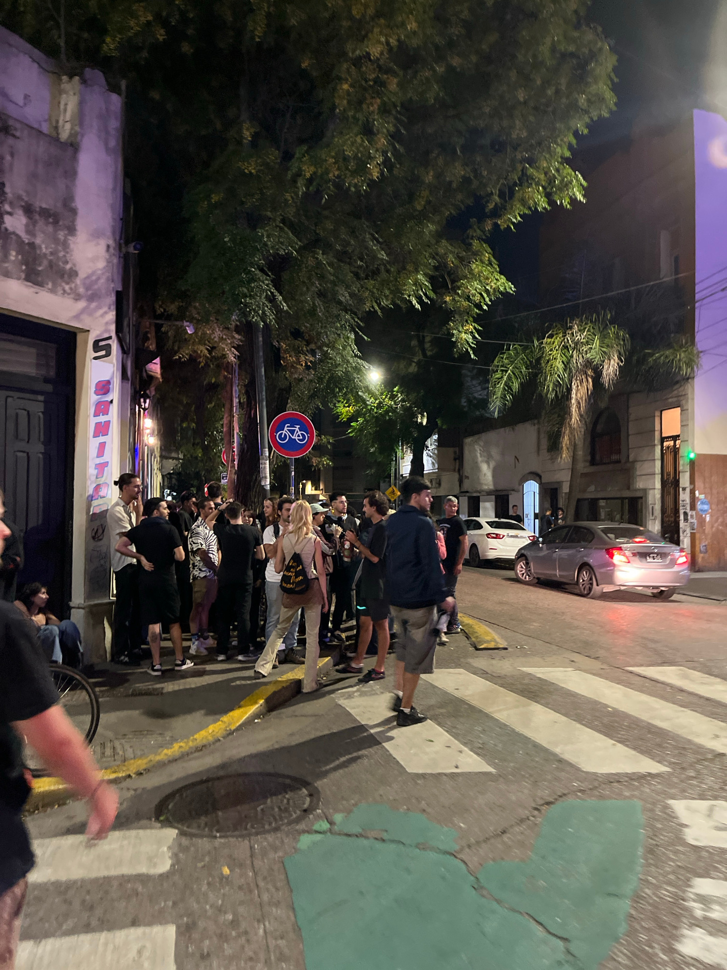 The image shows a nighttime scene on a street in Buenos Aires, Argentina. A group of people are standing on a crosswalk. Several parked cars are visible. There's a bicycle lane painted green on the st…read more