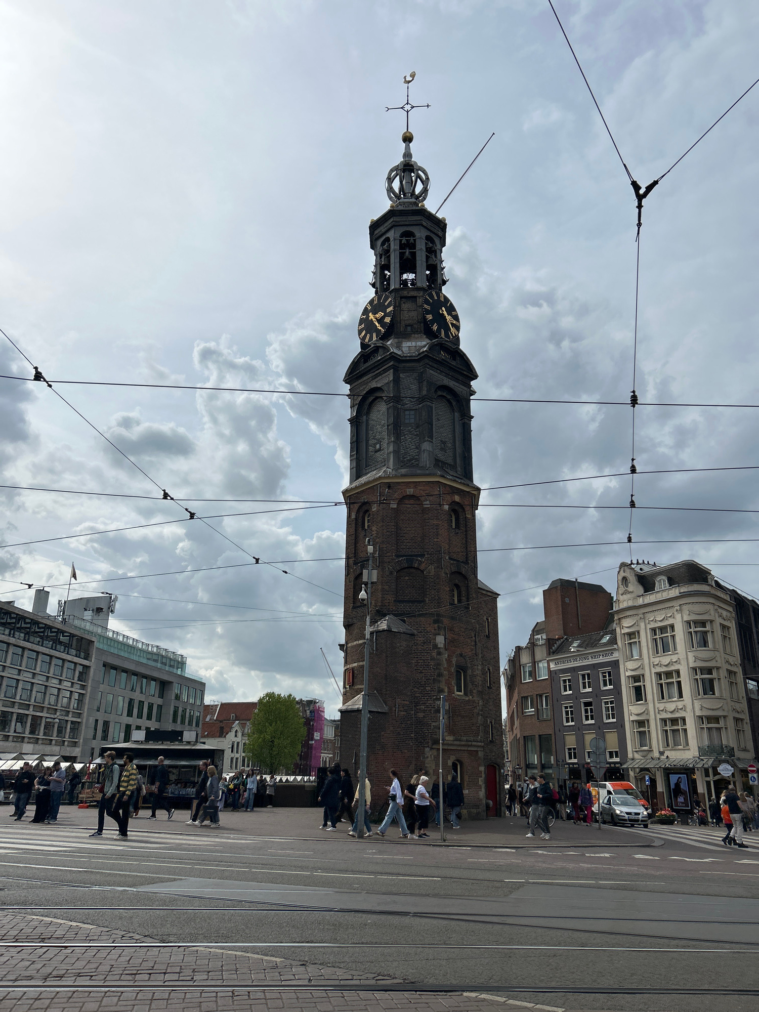 The image captures a dynamic urban scene in Amsterdam, Netherlands, under an overcast sky filled with heavy grey clouds. A prominent, tall brick clock tower, likely the Munttoren, dominates the left sā¦read more