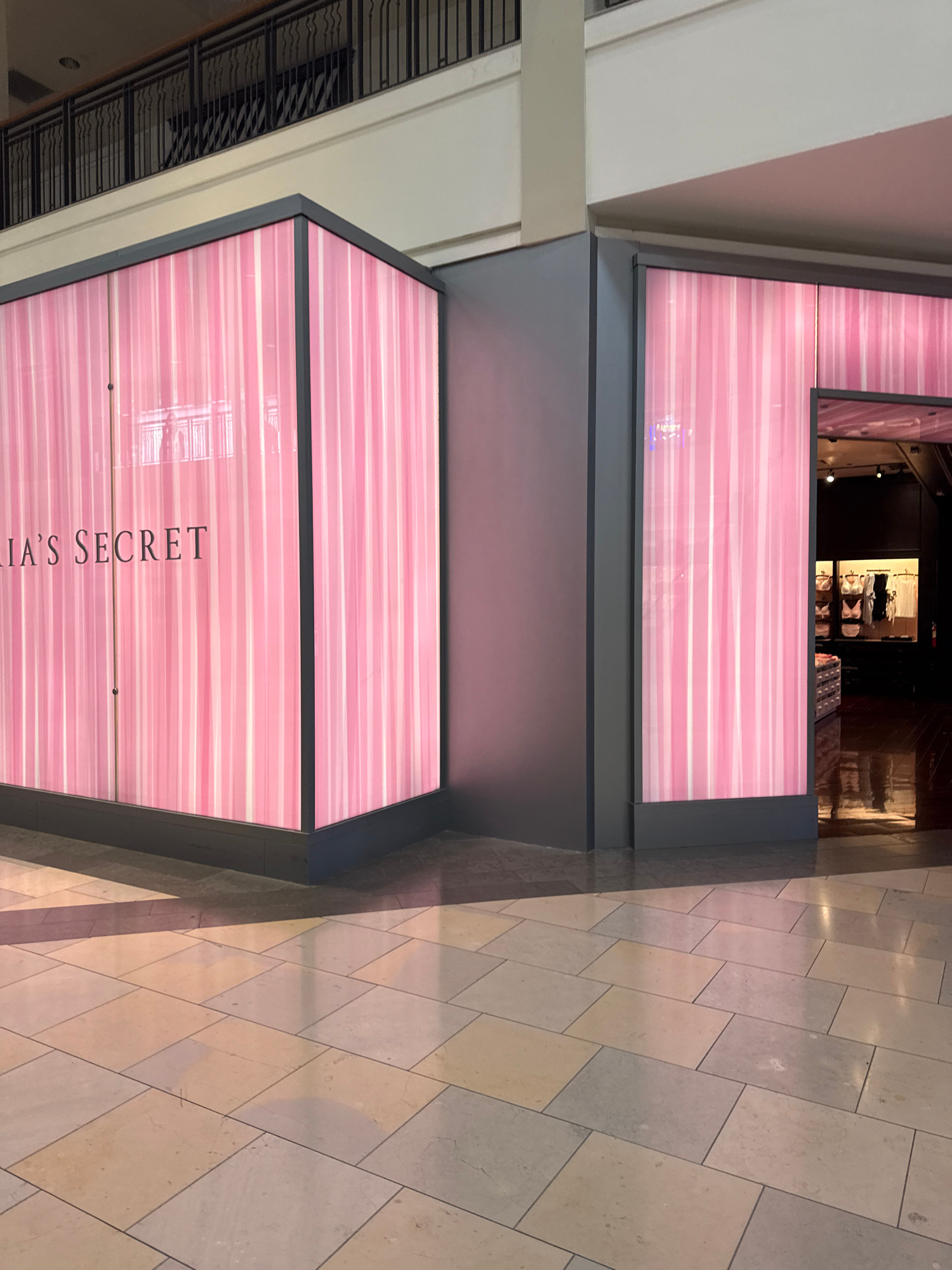 The image shows the exterior of a Victoria's Secret store, likely located in a shopping mall or center. The walls of the store are decorated with pink and white striped panels. The name "Victoria's Se…read more