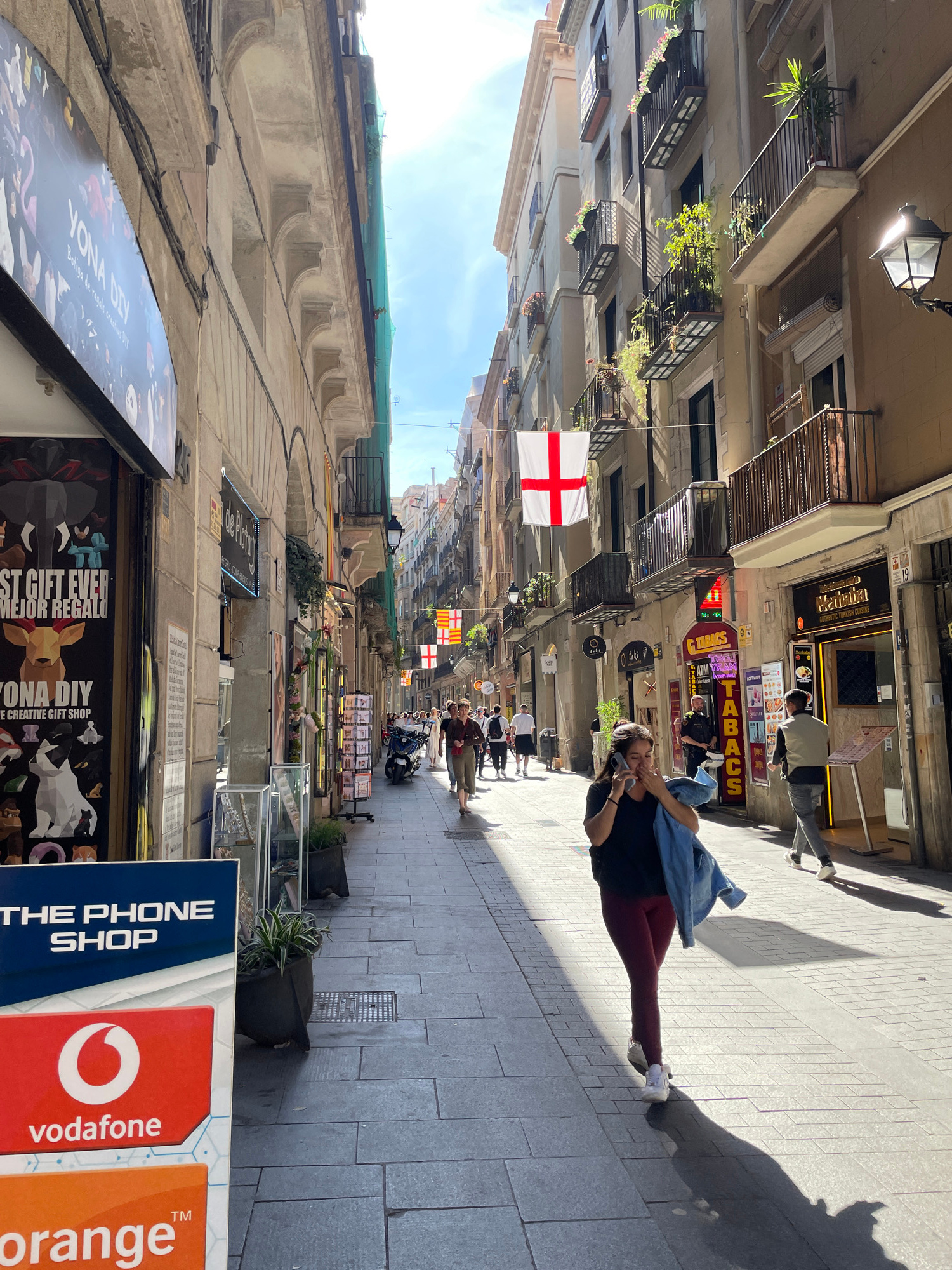 A street view in Barcelona, Spain. A woman wearing dark leggings, a dark shirt, and white shoes is walking down a street. She is carrying a denim jacket draped over her shoulder. There are several fla…read more