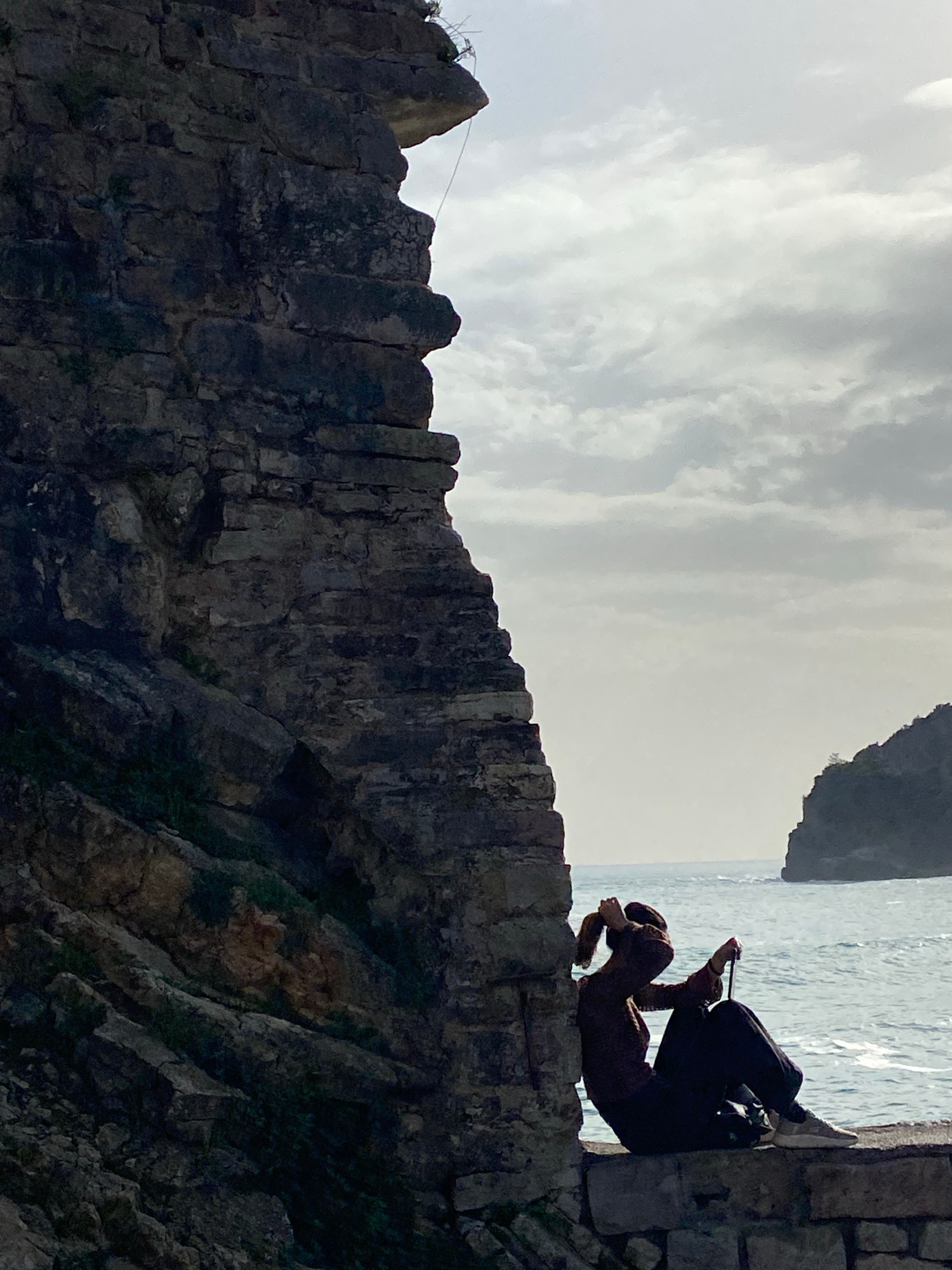 A sideways image captures a person sitting on a stone wall with the sea and sky in the background. The stone wall is made of irregular, dark-colored stones. Green vegetation grows from the cracks and…read more