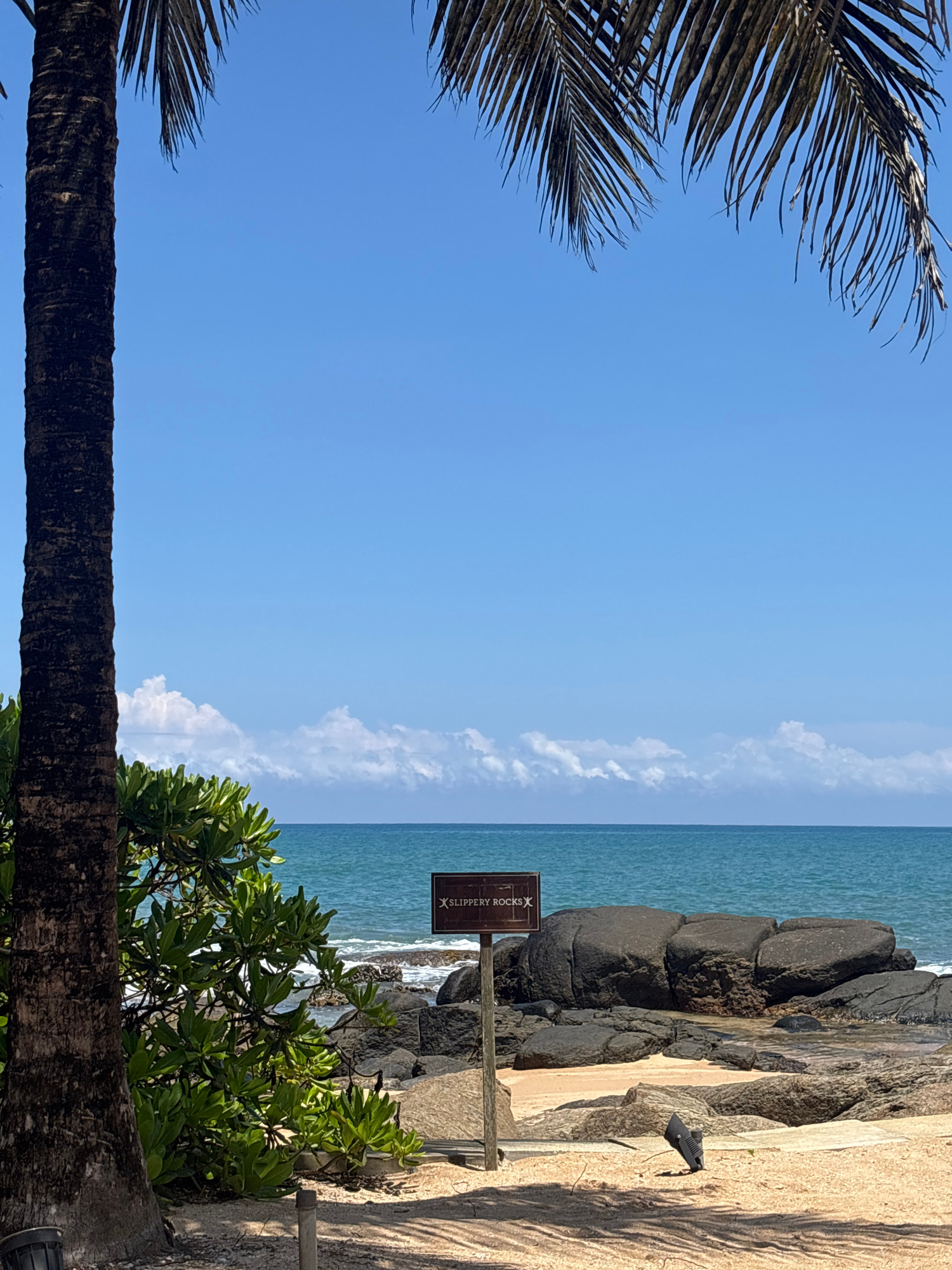 The image captures a vibrant, sunlit tropical coastline, seen from a slightly elevated perspective. A clear blue sky, sparsely dotted with fluffy white clouds, dominates the upper half of the frame. T…read more