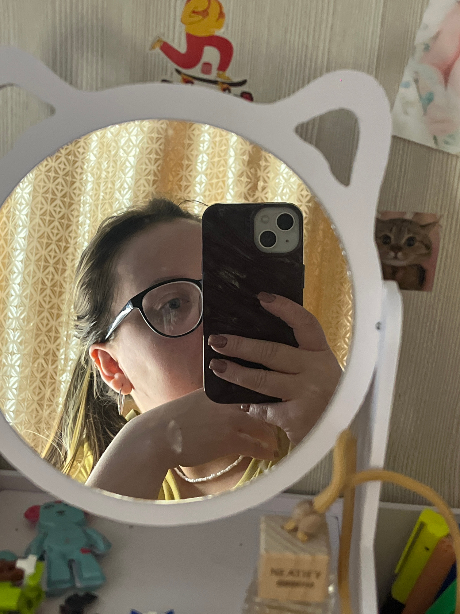 A mirror selfie shows a person holding a smartphone up to their face. The person is wearing glasses and a yellow shirt. The mirror has cat ear-shaped accents. In the background, items such as a cat pi…read more