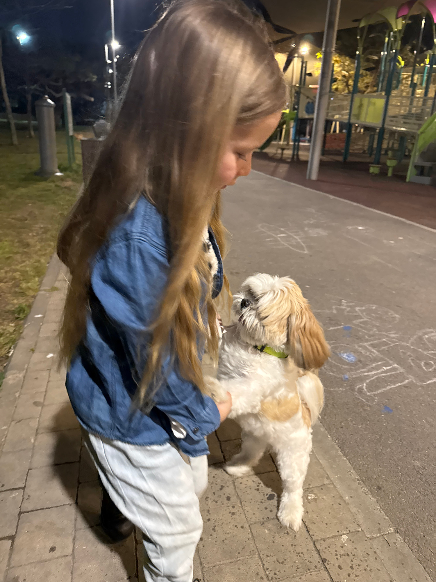 A young girl with long blond hair is sitting on a sidewalk in Bat Yam, Israel, interacting with a small, tan and white Shih Tzu dog wearing a green collar. The sidewalk is paved with gray bricks and fâŚread more
