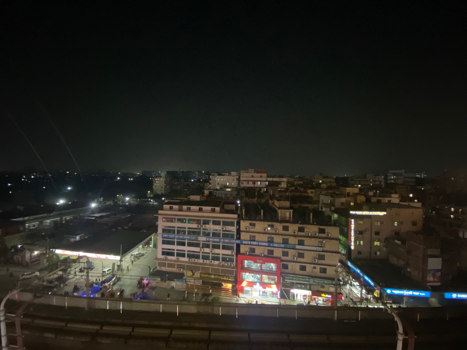 The image depicts a nighttime scene in Dhaka, Bangladesh, showcasing an urban area with buildings, streetlights, and a railway line in the foreground. The "South Point School & College" signage is vis…read more