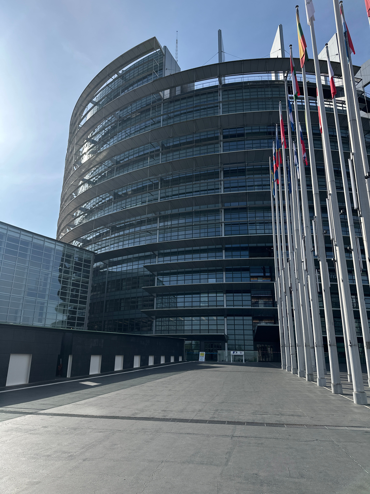 The image displays a large, modern architectural building under a clear, bright blue sky, strongly suggesting the European Parliament's Louise Weiss building in Strasbourg, France, given the presence…read more