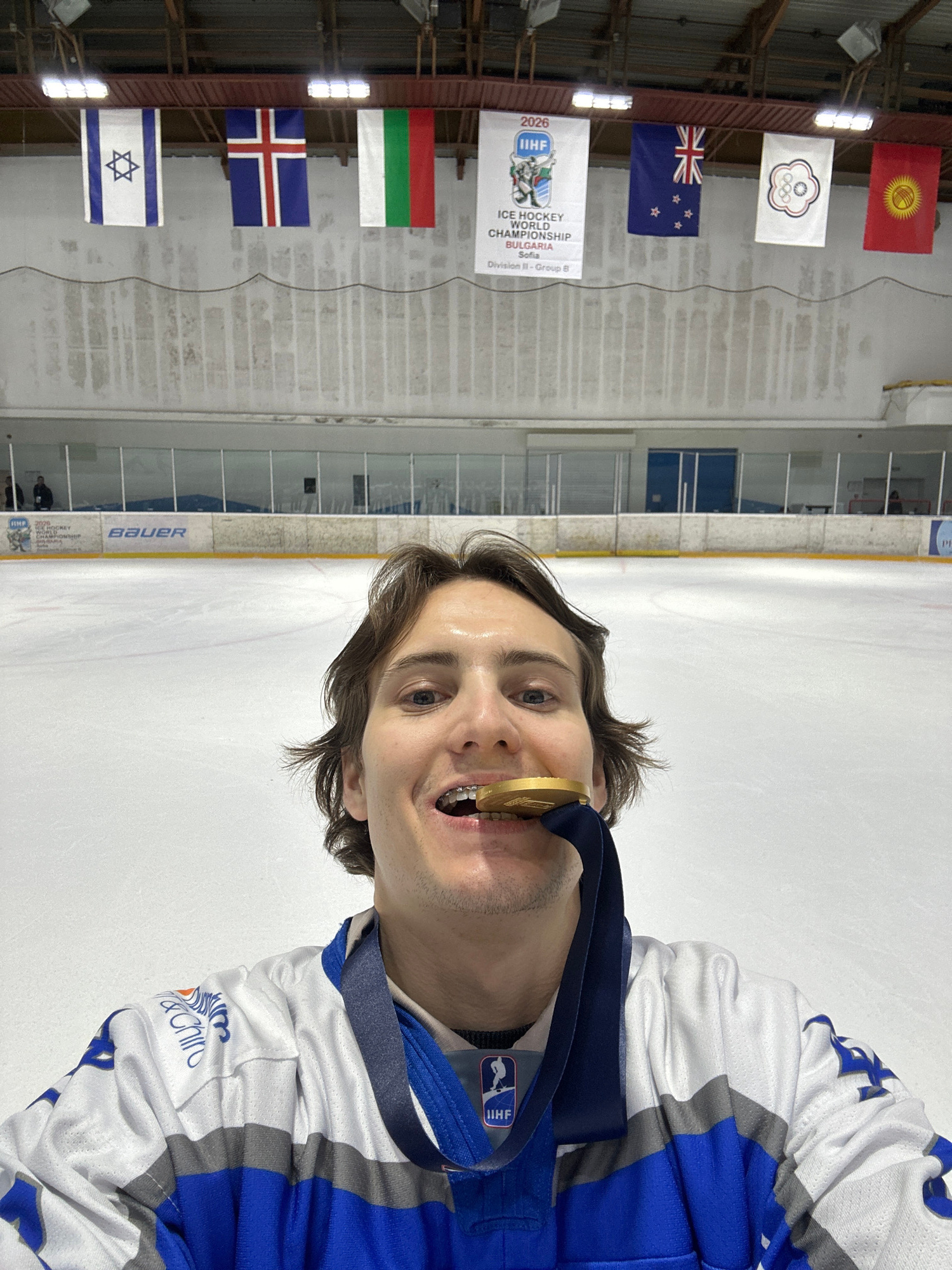 A man is on an ice rink. He is wearing a hockey jersey with a logo on the chest, and he has a gold medal in his mouth. Behind him are several flags and a banner that reads "2026 IIHF Ice Hockey World…read more