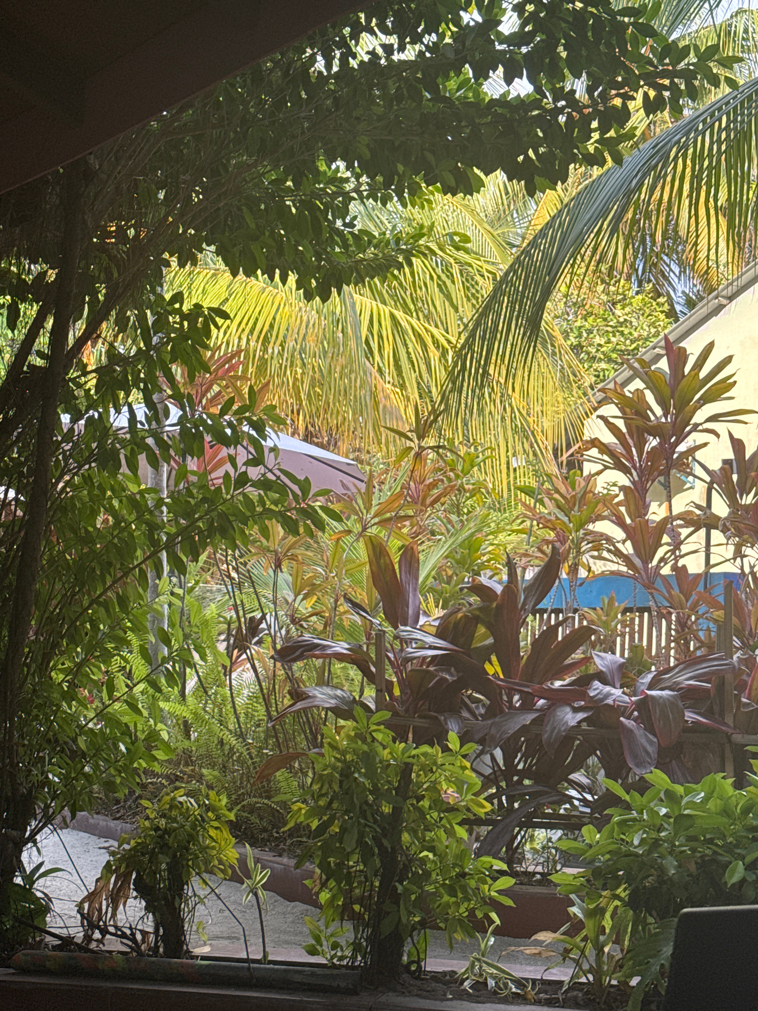 The image shows a view from a window in Ukulhas, Maldives. Lush green foliage, including a coconut palm frond, fills the frame. The leaves suggest a tropical environment. A building is partially visib…read more