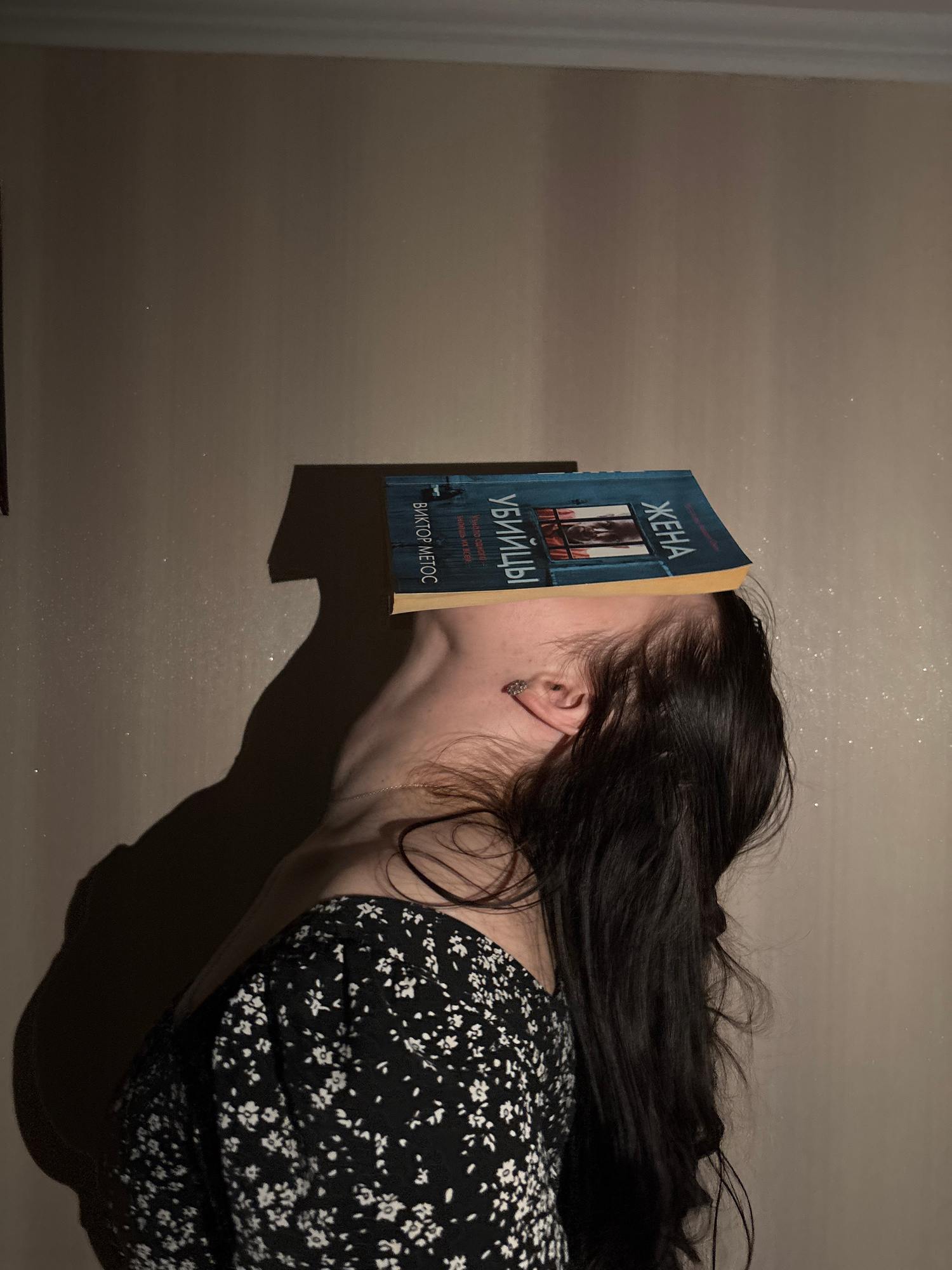 A woman is depicted horizontally, with her face obscured by an open book. She has long, dark hair splayed out, covering parts of the light brown background. Her visible ear sports a small, intricate e…read more