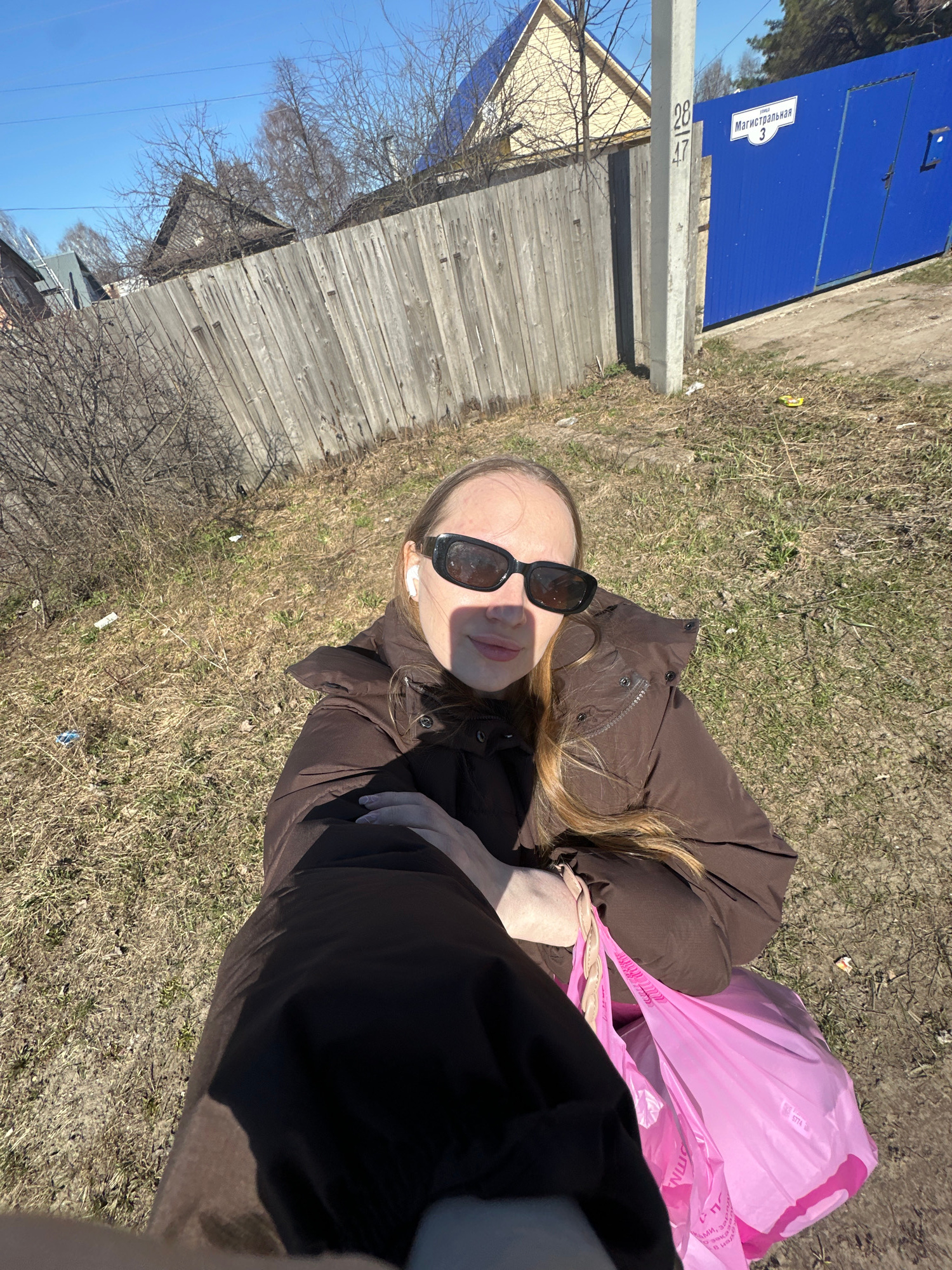 The image shows a woman wearing sunglasses and a brown jacket, holding a pink bag. She is lying on the ground with dry grass. Behind her is a gray wooden fence, a blue gate with a street sign, and a u…read more