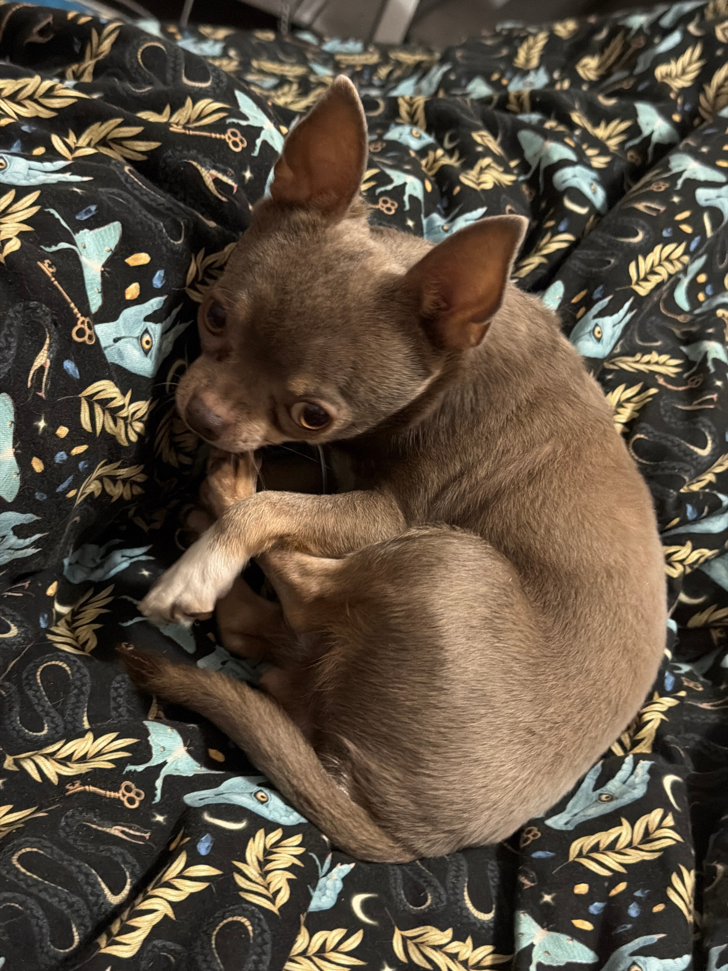 A brown Chihuahua is curled up on a dark blanket with a mystical pattern of keys, snakes, and figures with teary eyes. The location is not evident from the visual information provided.