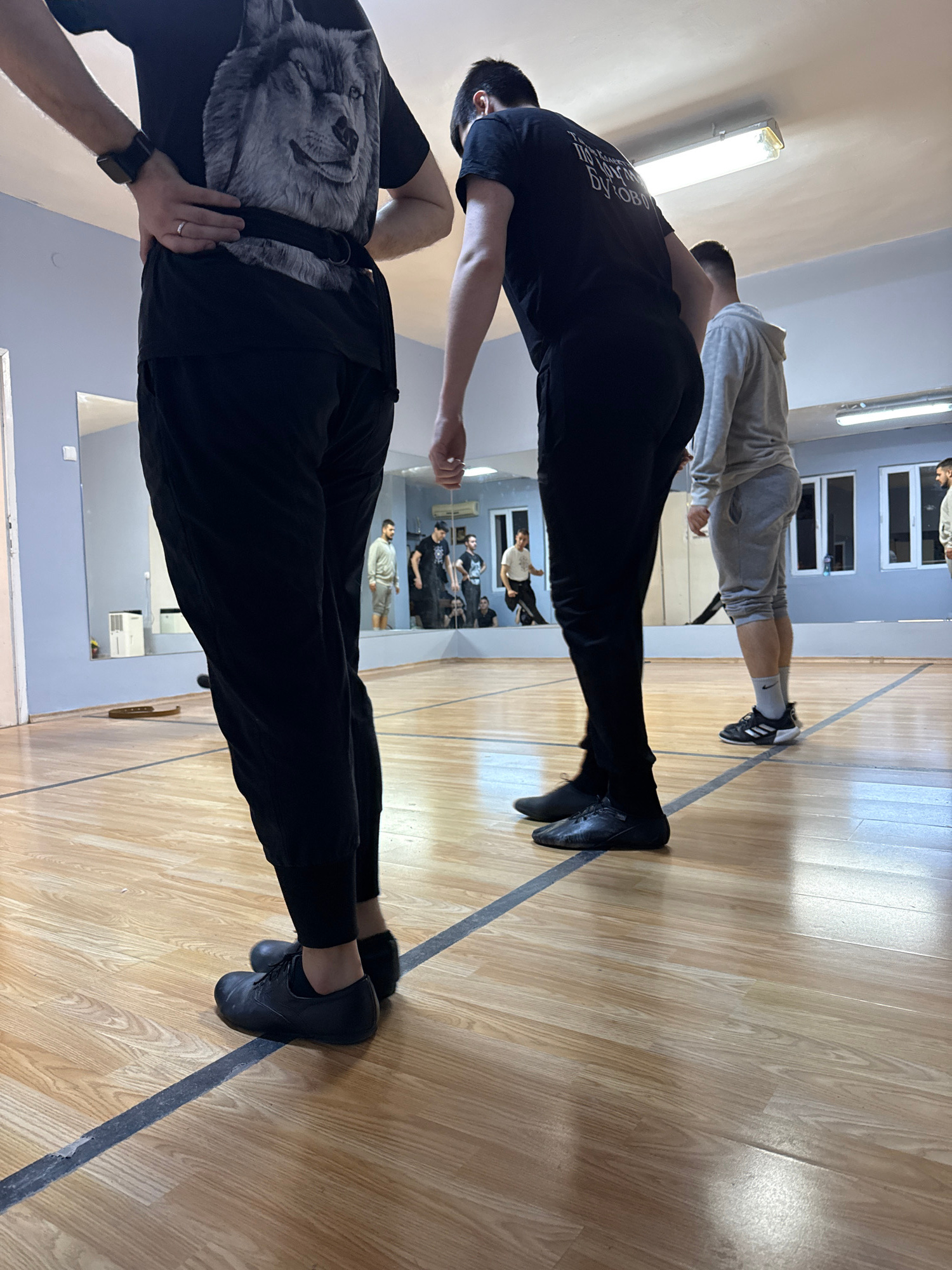 The image displays an indoor scene, likely a training studio or gym, characterized by a light wooden floor with a dark line marking, light-colored walls, and large mirrors reflecting parts of the room…read more