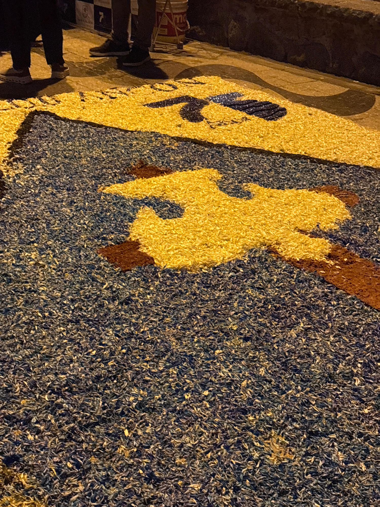 The image shows a flower carpet in Ancón, Peru. The carpet features a blue background with areas filled with yellow and brown flowers, depicting a figure. People stand near the carpet, partially visib…read more