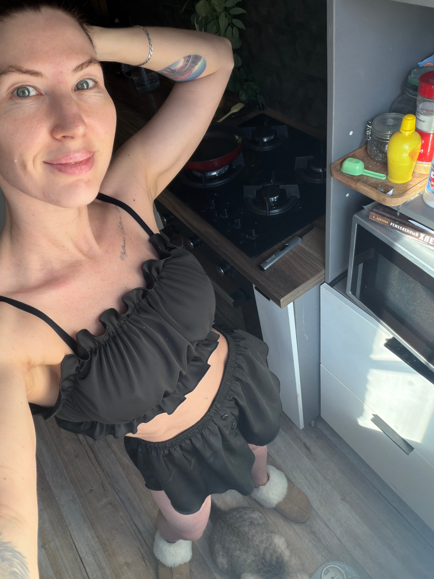 A young, Caucasian woman is lying on a wooden floor in a kitchen, seemingly taking a selfie. She is wearing a black ruffled bra-style top and matching shorts. Her left arm is raised above her head, di…read more