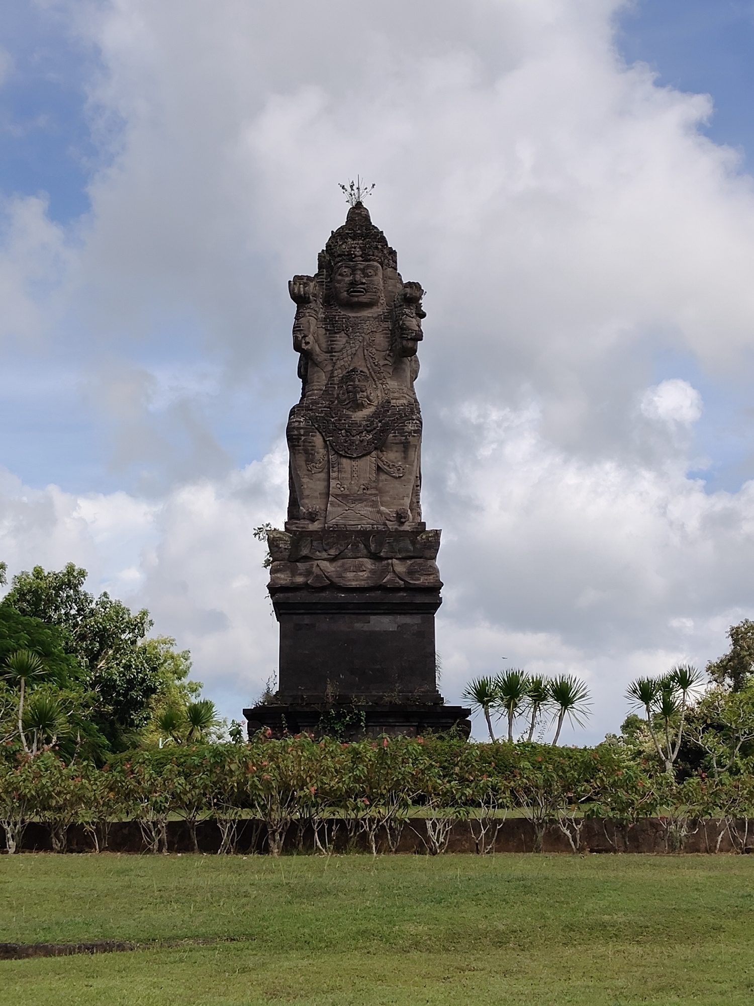 The image shows a tall, weathered stone statue with multiple faces, likely a deity or a mythical figure, standing on a tiered base in Pecatu, Indonesia. The statue is positioned in a grassy area with…read more