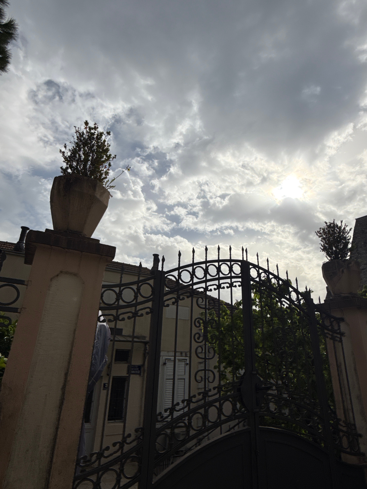 A low-angle, tilted shot focuses on an ornate black iron gate and stone fence pillars framing a building in Herceg Novi, Montenegro. The sky is filled with white and gray clouds, with sunlight partial…read more