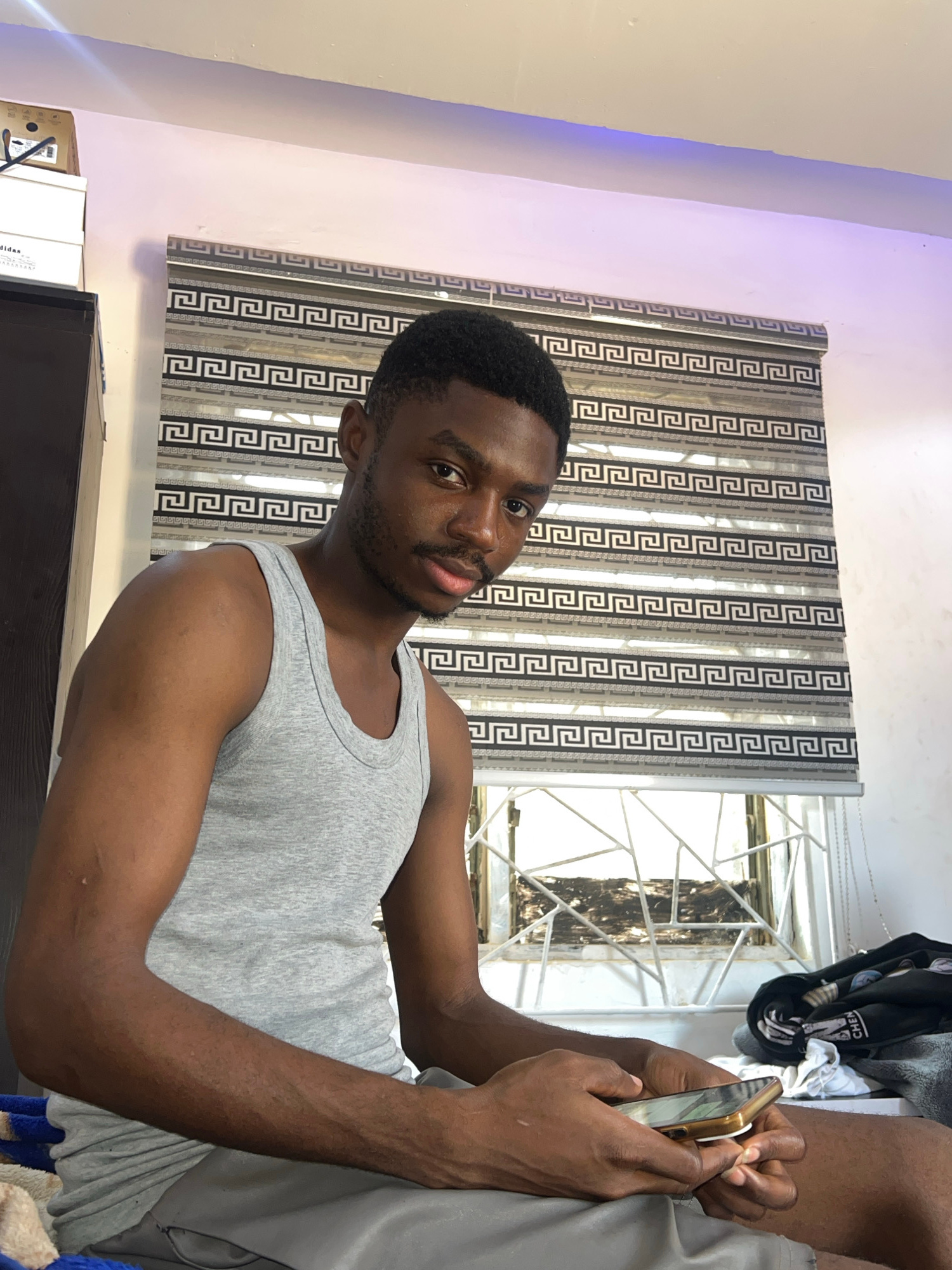 The image, possibly captured in Jos, Nigeria, features a young man of African descent looking directly at the camera with a neutral expression. He is wearing a plain grey tank top. His hands are visib…read more