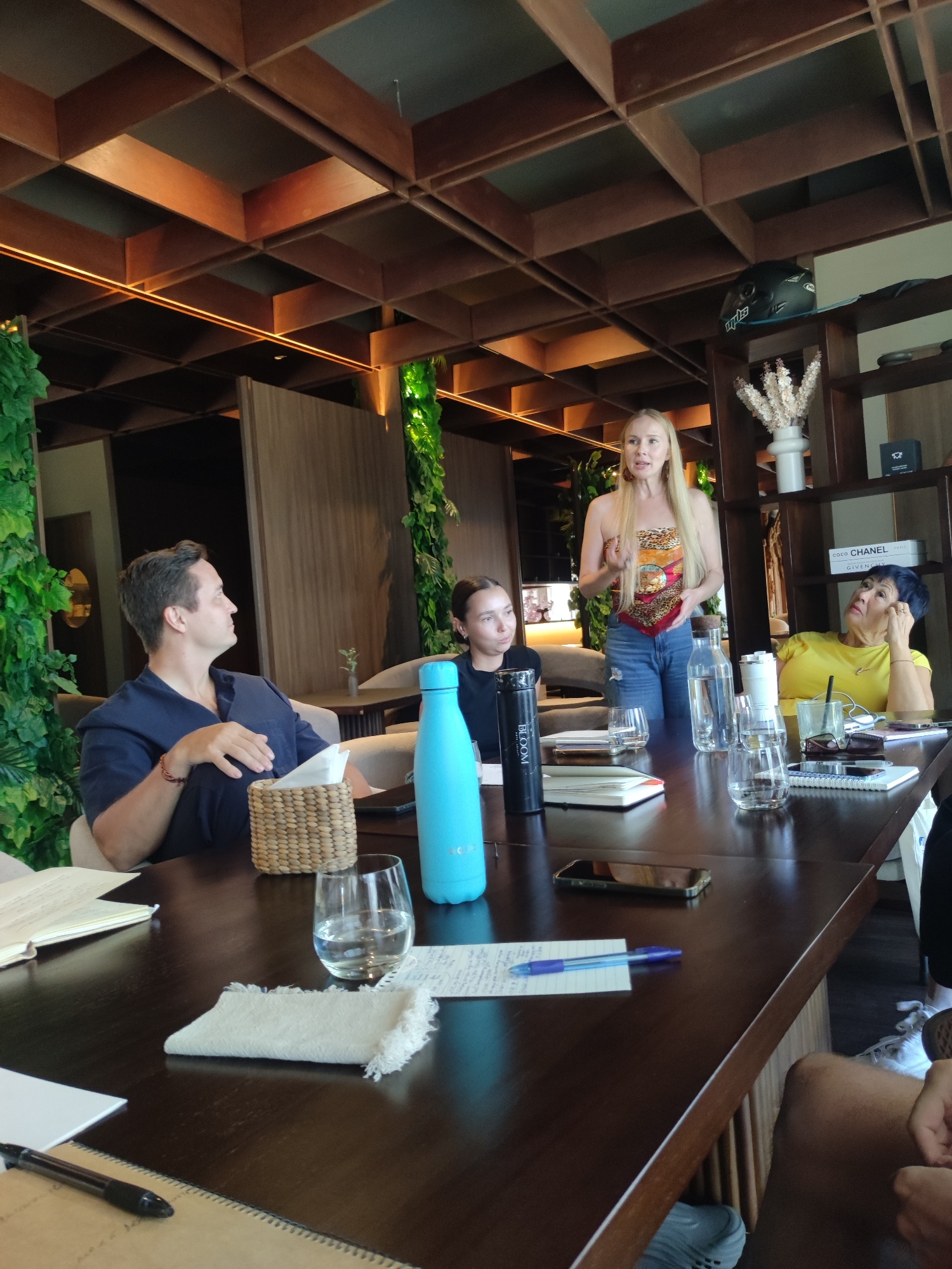 A group of four individuals is gathered around a dark brown wooden table in what appears to be a restaurant or a meeting space in North Kuta, Indonesia. The space is characterized by a prominent woode…read more