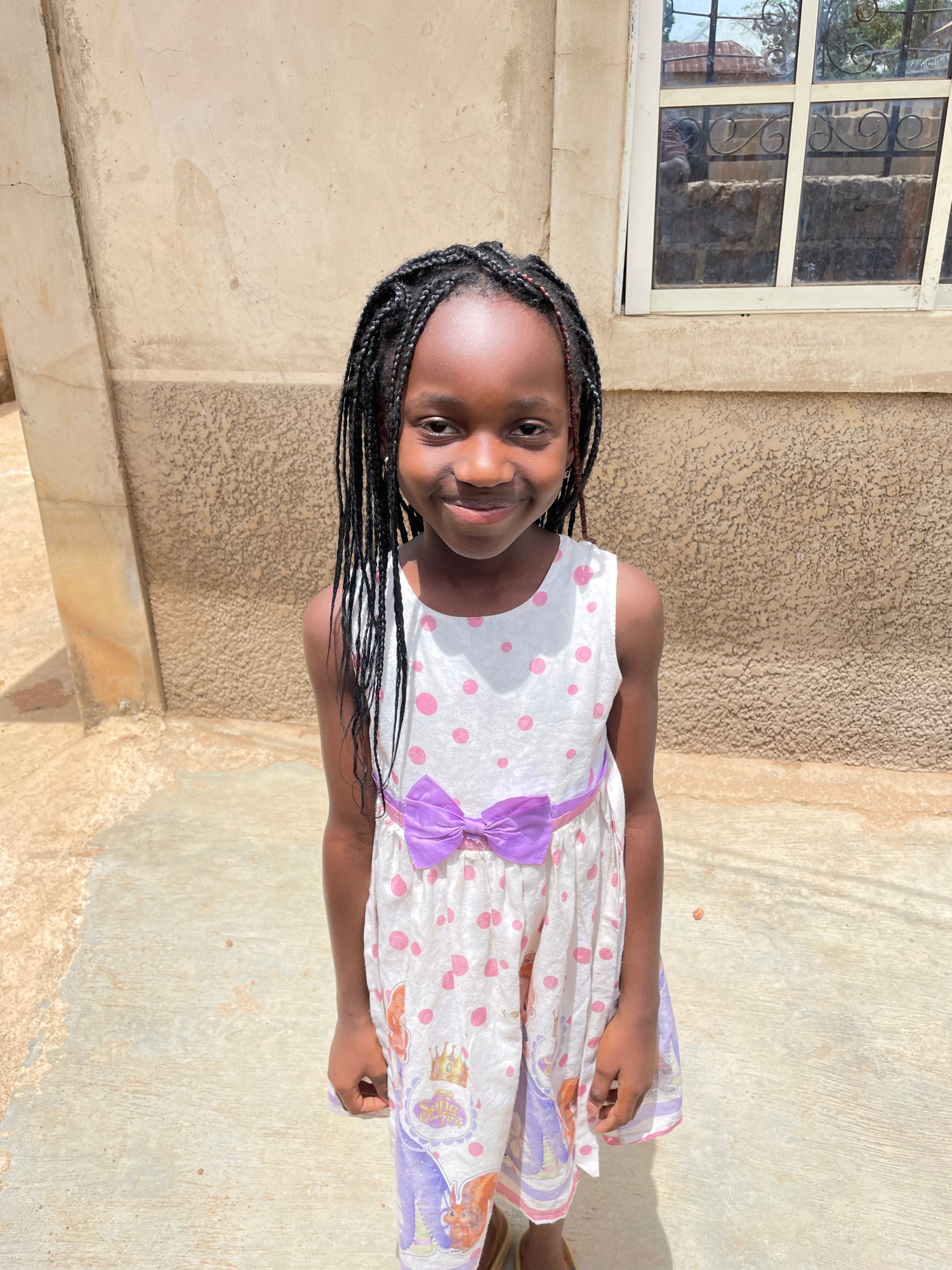 A young girl stands outdoors near a building with a window, possibly in Jos, Nigeria. She wears a light-colored dress with pink polka dots and a purple bow. The building's exterior is a textured beige…read more