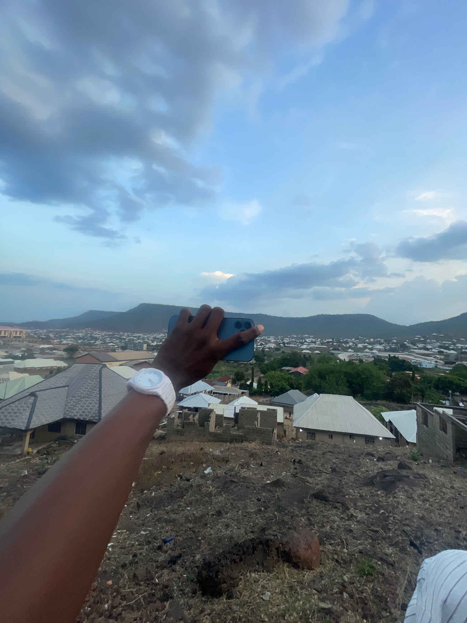 The image, correctly oriented, presents a panoramic view from an elevated position, likely in Lokoja, Nigeria. In the foreground, a person's dark-skinned arm extends from the lower right, holding a bl…read more