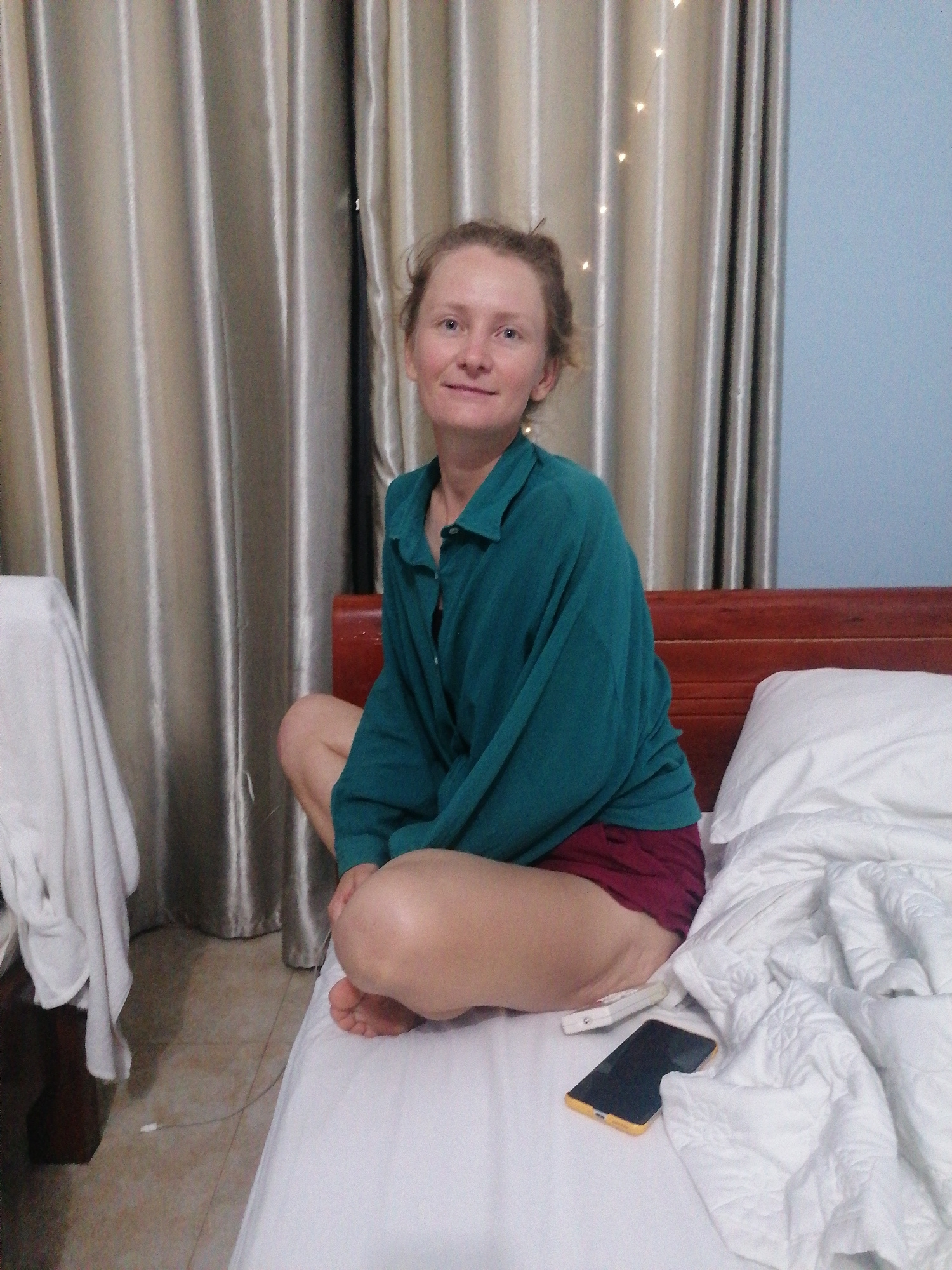 A Caucasian woman sits cross-legged on a white bed in what appears to be a hotel room in Bai Chay Ward, Vietnam. The woman has light skin, blonde hair pulled back, and is wearing a teal button-down sh…read more