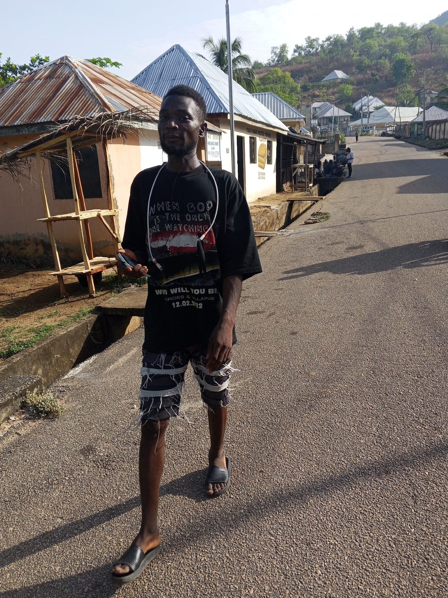A young man walks down a paved road in Lokoja, Nigeria. He is wearing a black t-shirt with white text and an image on the front, fringed shorts, and sandals. He has earbuds around his neck and is hold…read more