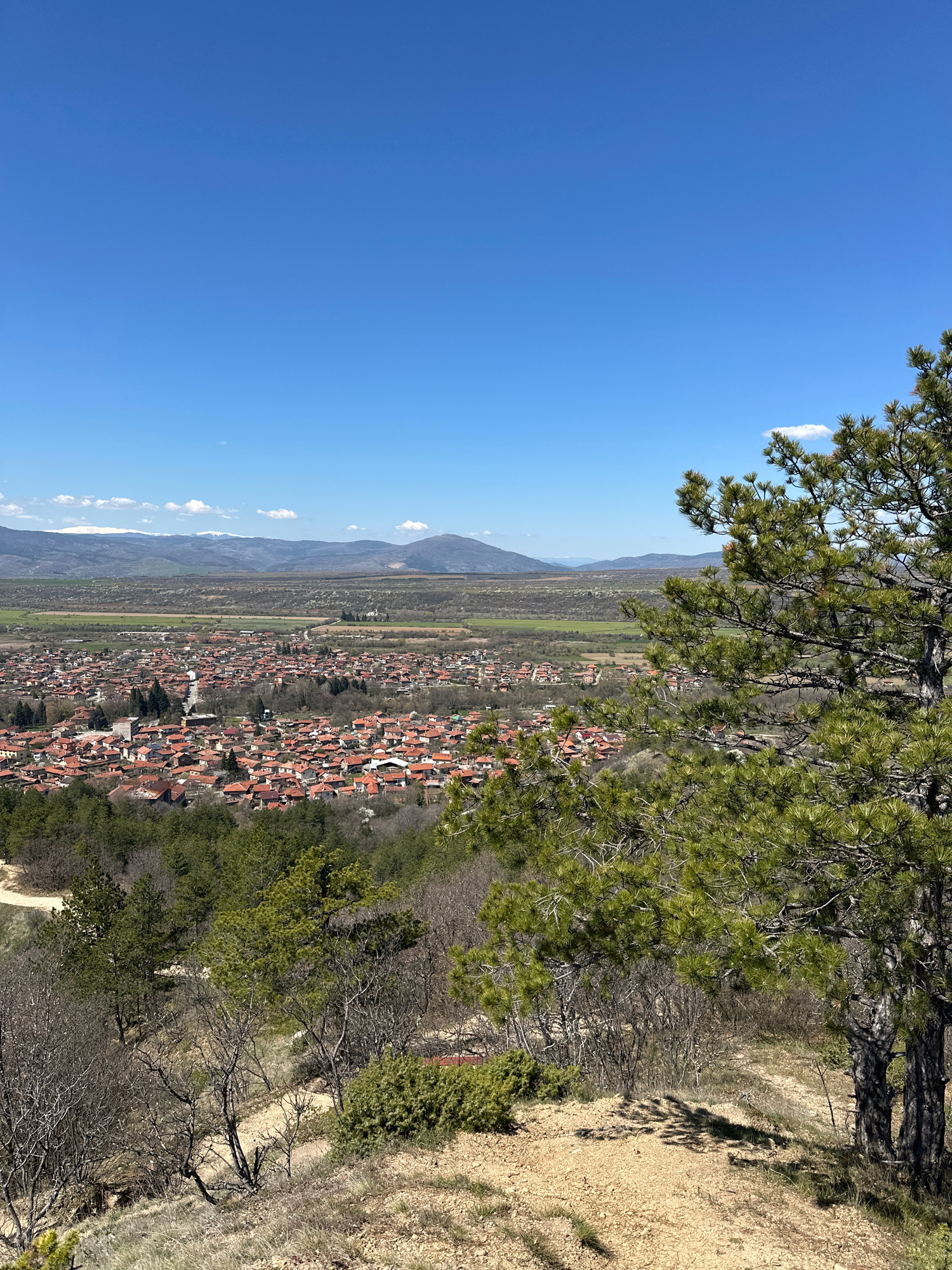 The image shows an aerial view of Stob, Bulgaria. The foreground features a sloped terrain with trees and vegetation, suggesting the edge of a forest or elevated area. The town of Stob is visible, cha…read more