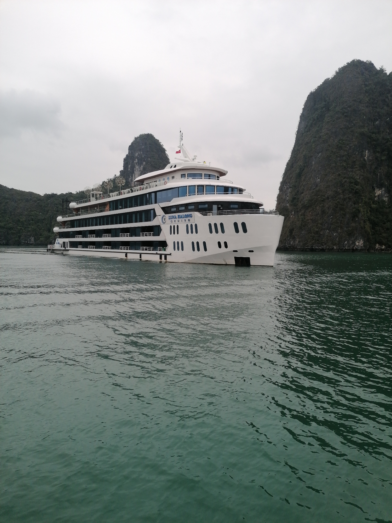 A large, white, multi-deck cruise ship, named "LUNA HALONG CRUISE," is depicted on calm, greenish-blue water. The ship features numerous windows, balconies with railings, and a rounded observation dec…read more