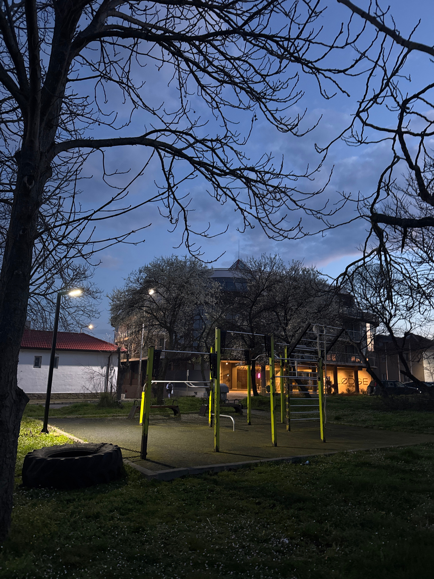 The image shows an outdoor gym in what is likely Tsarevo, Bulgaria, given the context. The scene is captured at dusk or early evening, with a blue sky partially obscured by bare tree branches in the fâŚread more