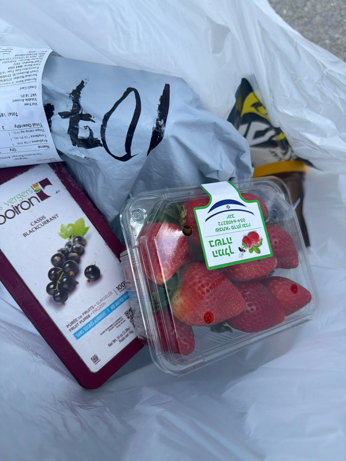 A white plastic shopping bag rests on a light-colored outdoor surface, likely concrete or pavement, under natural light. The bag contains multiple items. A partially unfolded white paper receipt is v…read more