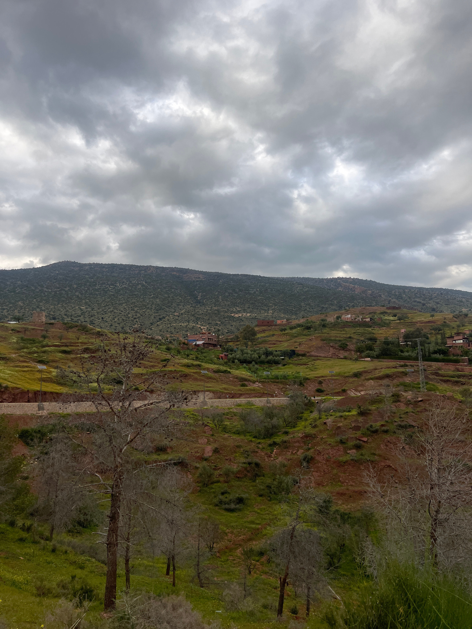 The image depicts a landscape near Bin El Ouidane, Morocco, under a cloudy sky. A steep, terraced hillside dominates the scene, displaying a mix of green vegetation and red soil. Scattered buildings a…read more