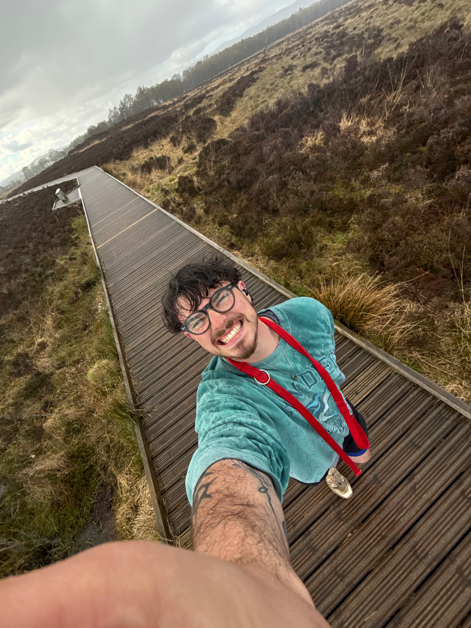 A man is taking a selfie while standing on a wooden boardwalk in a grassy, field-like area. The boardwalk extends into the distance. He is wearing glasses, a blue-green shirt, and a red strap across h…read more