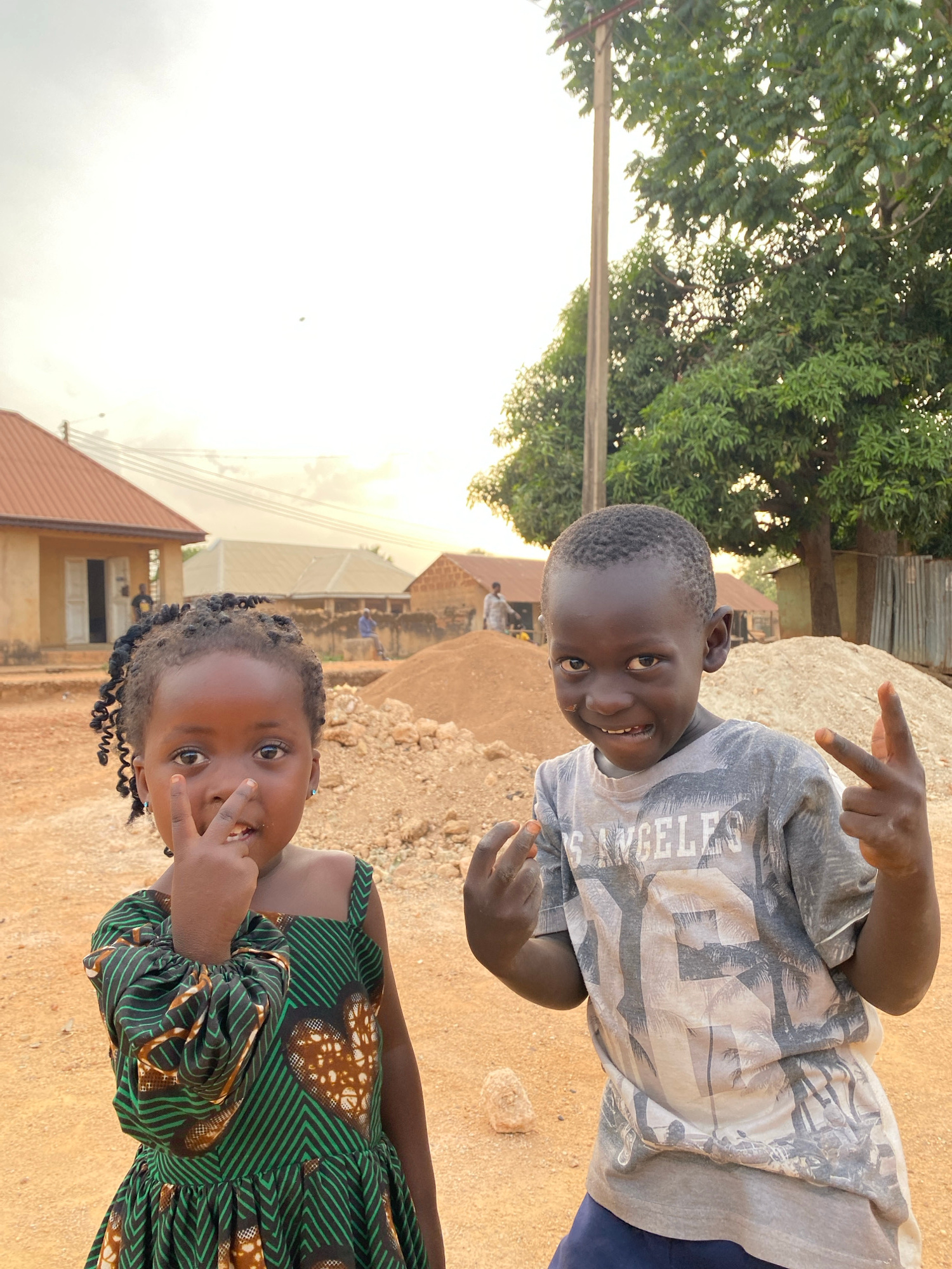 Two children, a boy and a girl, are photographed outdoors in Kuru Dungus, Nigeria. The boy wears a patterned t-shirt and the girl wears a green and brown patterned dress. Both children are making a ha…read more