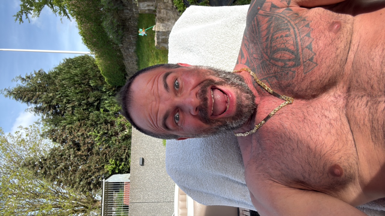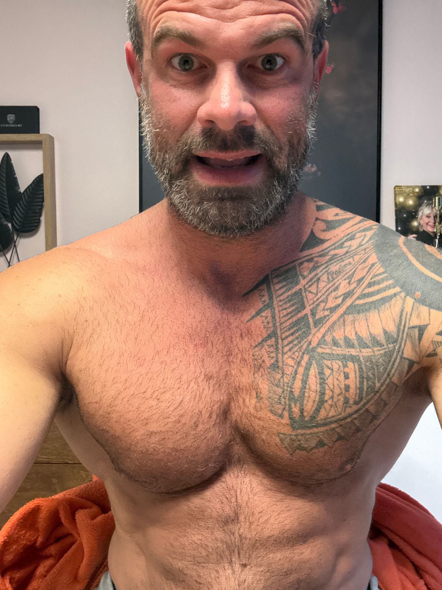 A close-up, slightly angled, portrait-style shot captures a shirtless man with a dense, grey-flecked beard and fair complexion. He has a surprised expression with slightly parted lips. His left should…read more