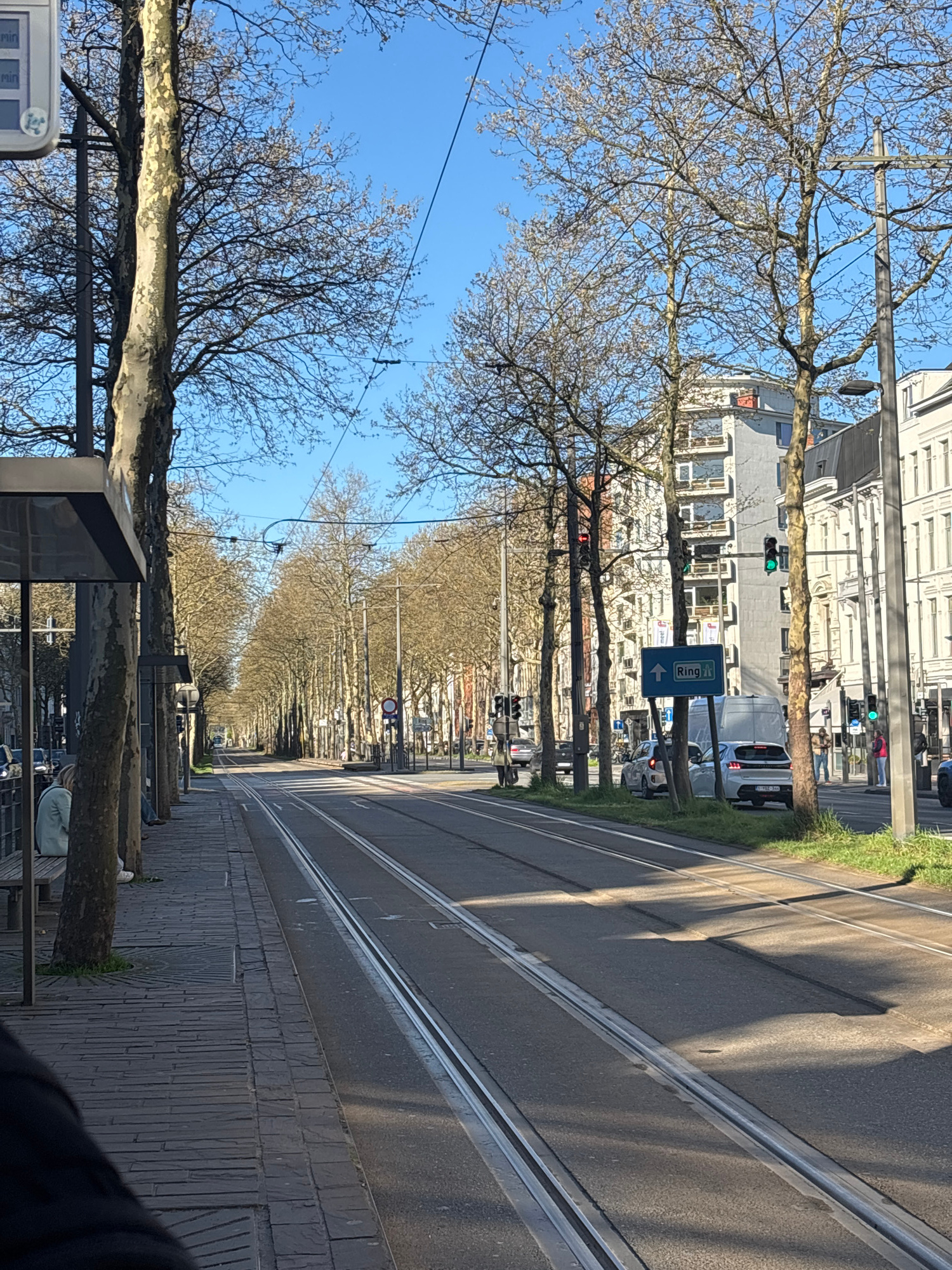 A street in Antwerp, Belgium, is depicted. The perspective is from a tram or light rail, with tracks running down the center of the road. Buildings line both sides of the street. Trees with bare branc…read more