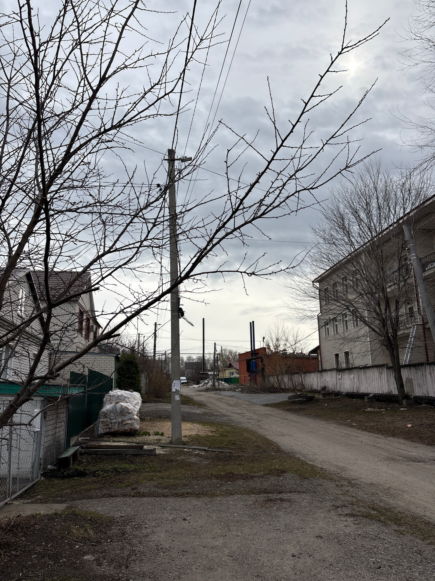 The image depicts an urban street scene in Ulyanovsk, Russia on a cloudy day. A bare tree with many branches is prominent in the foreground. In the mid-ground, a dirt road stretches into the distance,…read more