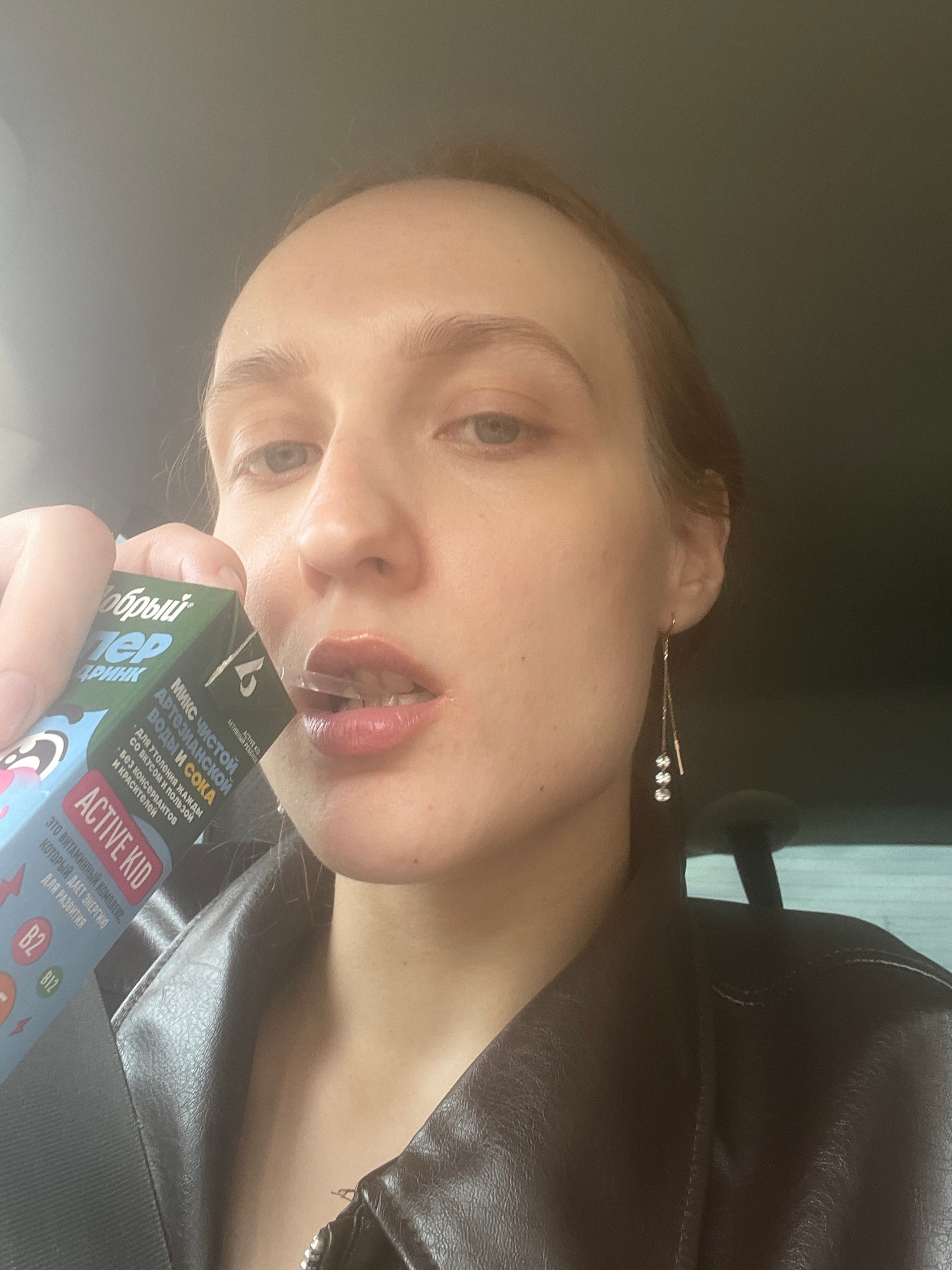 The image captures a close-up, rotated portrait of a person, likely female, from the chest up. The person's head is significantly tilted to the right, with their gaze directed forward. They have light…read more
