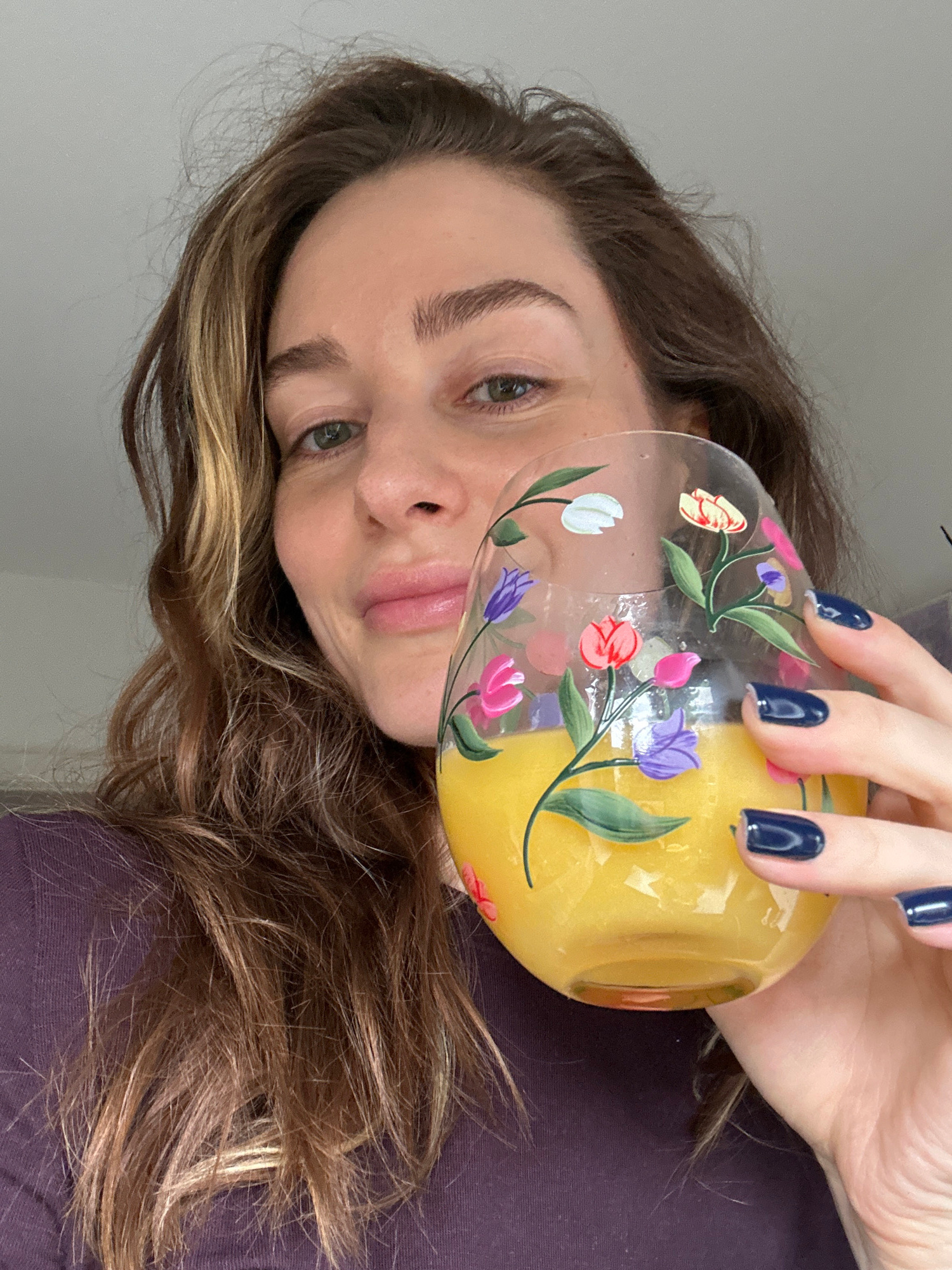 A woman is holding a glass of orange juice with floral designs on it. She has long, wavy brown hair with blonde highlights. Her fingernails are painted dark blue. She is wearing a dark purple shirt. T…read more
