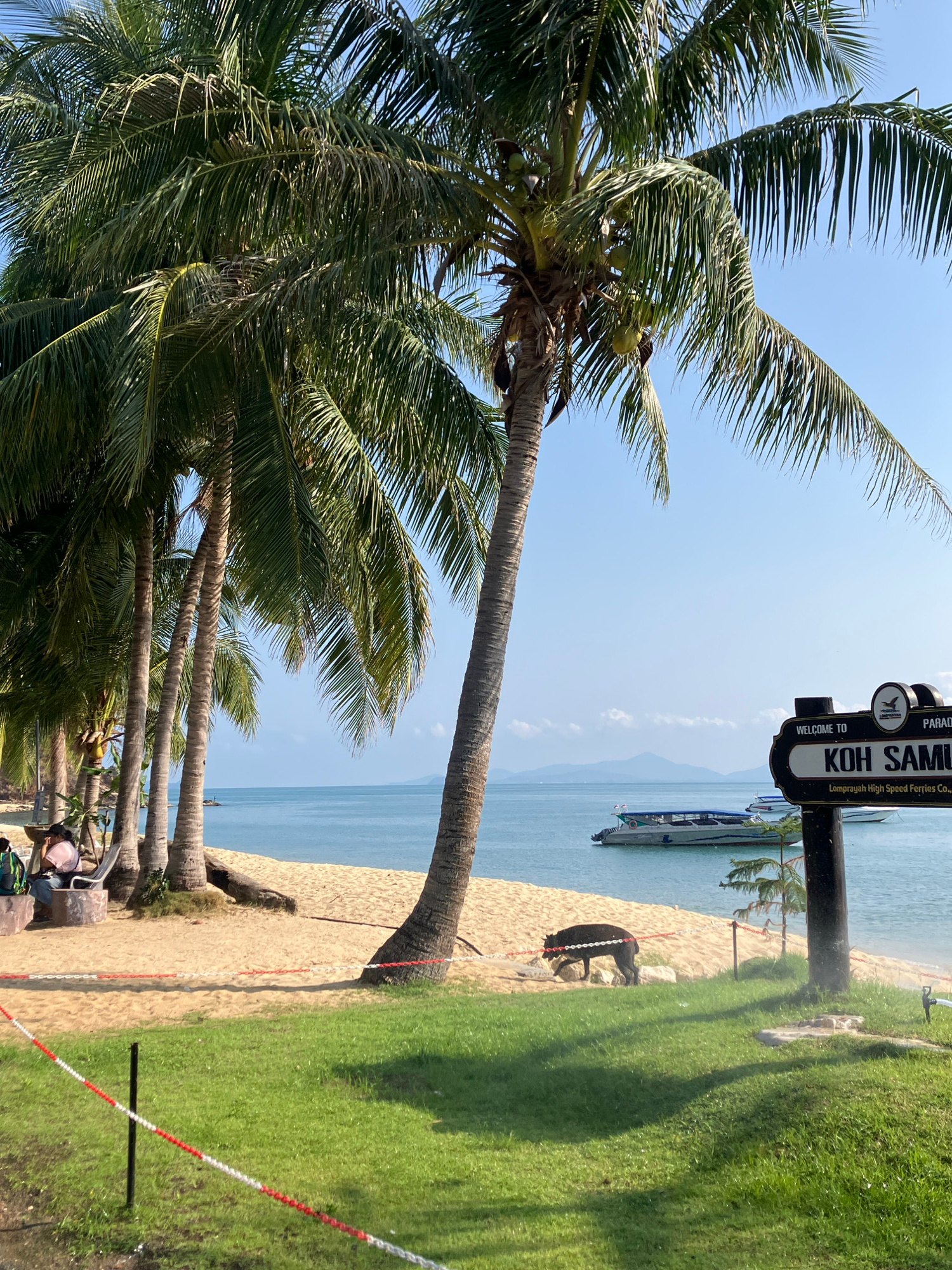 The image presents a beach scene in Baan Mae Nam, Thailand, identified by a “Welcome to Koh Samui” sign. The view showcases a sandy beach adjacent to a turquoise body of water. In the background are b…read more