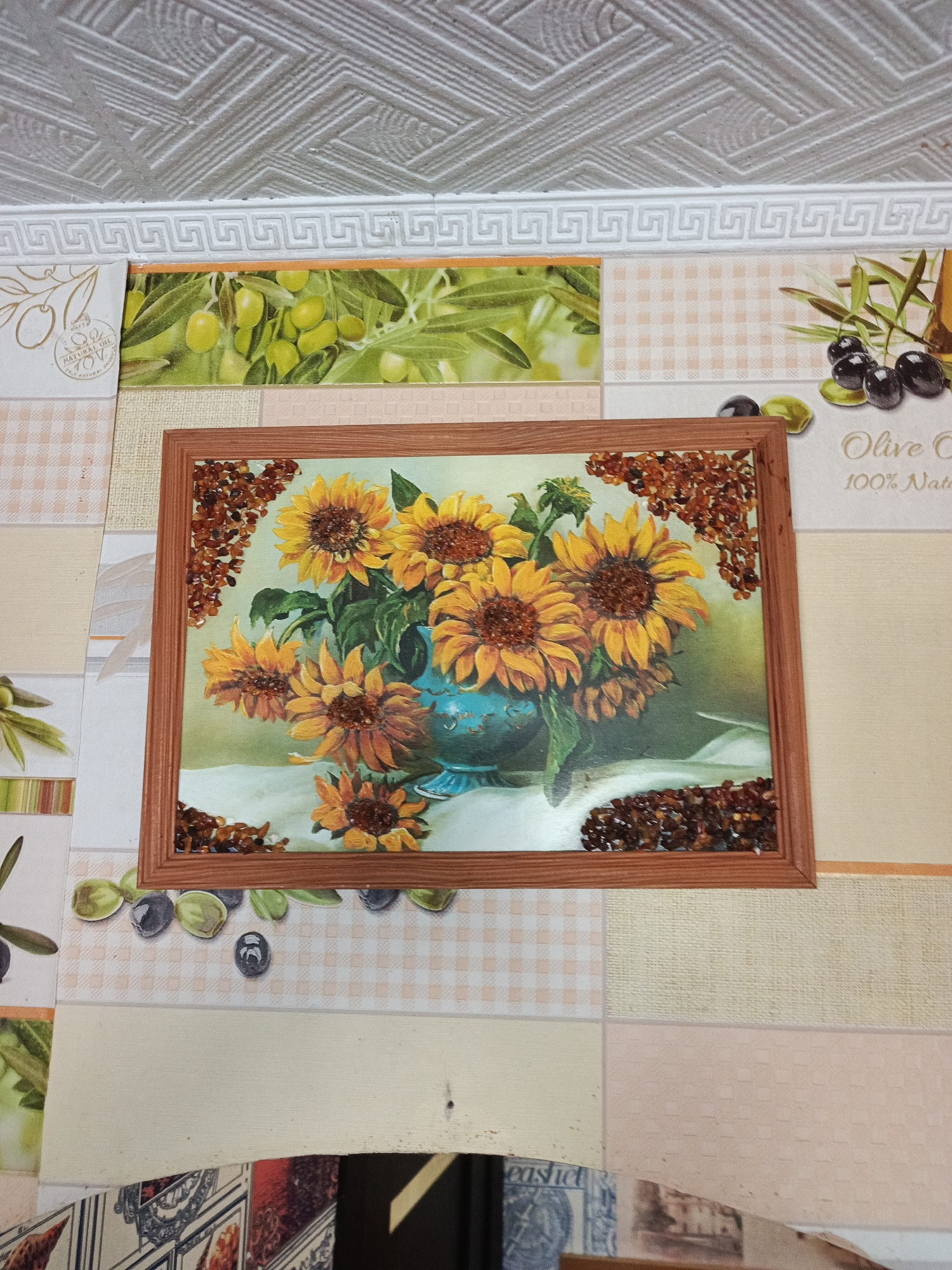 The image shows a framed painting of sunflowers in a blue vase, adorned with what appears to be amber pieces around the frame. The painting is hanging on a wall covered with a patchwork of tiles, some…read more