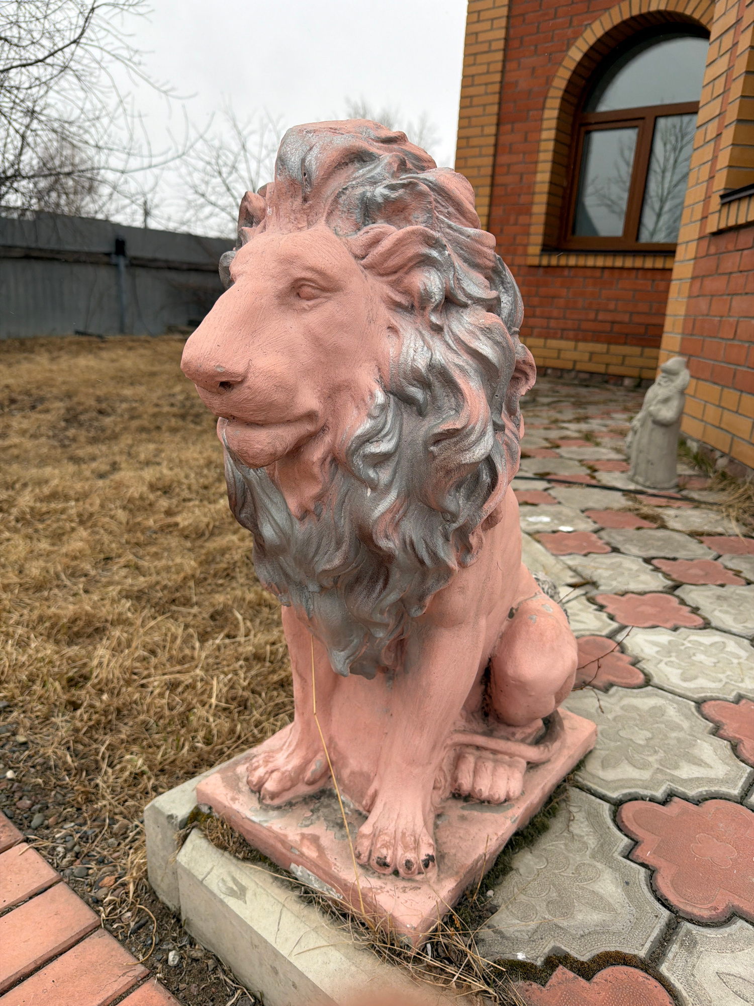 A color photograph, taken outdoors during daylight hours, depicts a reclining lion sculpture. The sculpture is painted a reddish-pink hue, with a gray mane. It is positioned on a light gray, square ba…read more