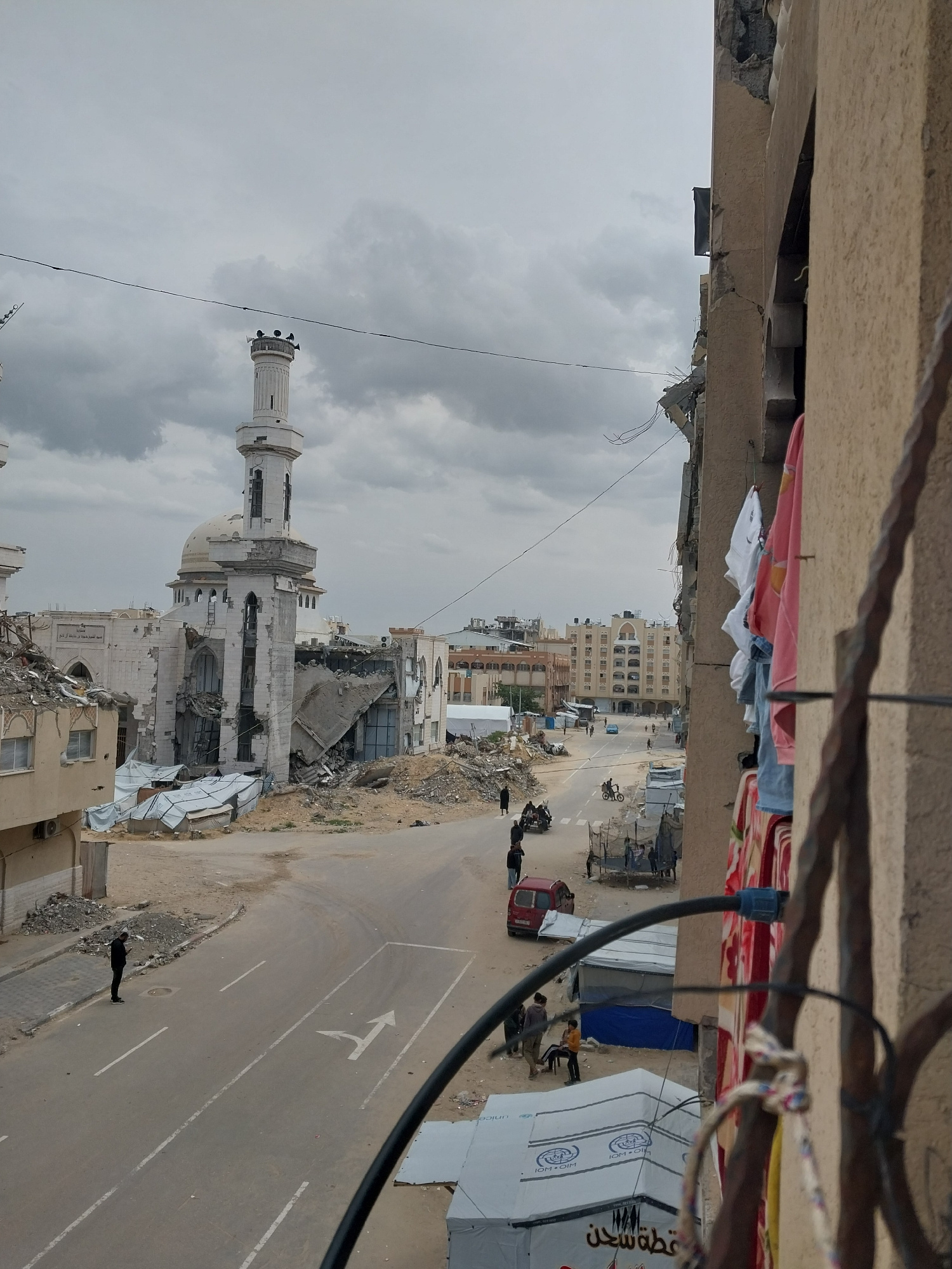 An aerial perspective captures a street scene in Khan Yunis, Palestinian Territory, under an overcast sky. The prominent subject is a large, partially destroyed white mosque with an intact minaret and…read more