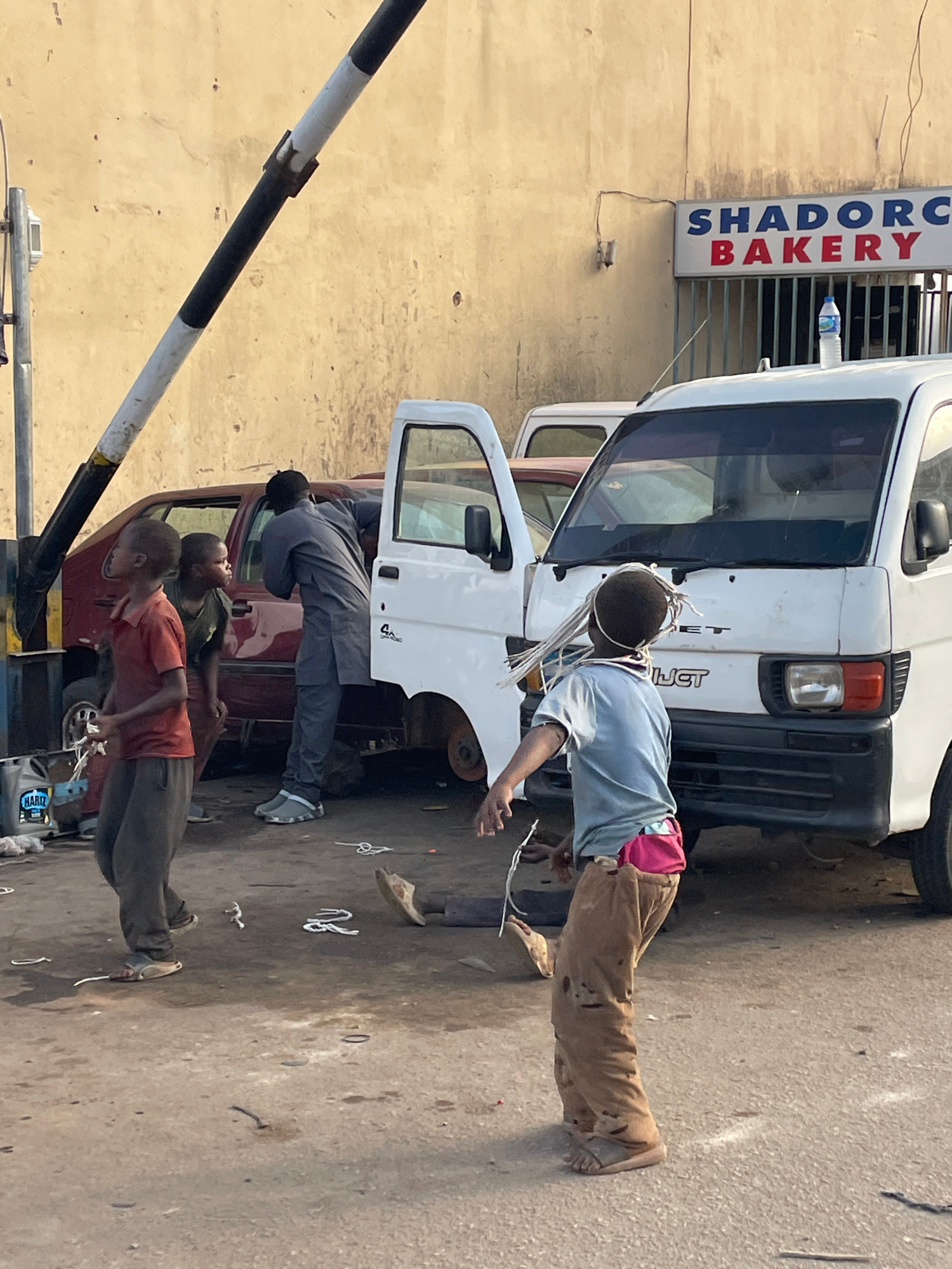 The image depicts a street scene in Jos, Nigeria, with several individuals gathered around vehicles, seemingly engaged in repair work. A white van and a maroon car are the primary vehicles in view, wi…read more
