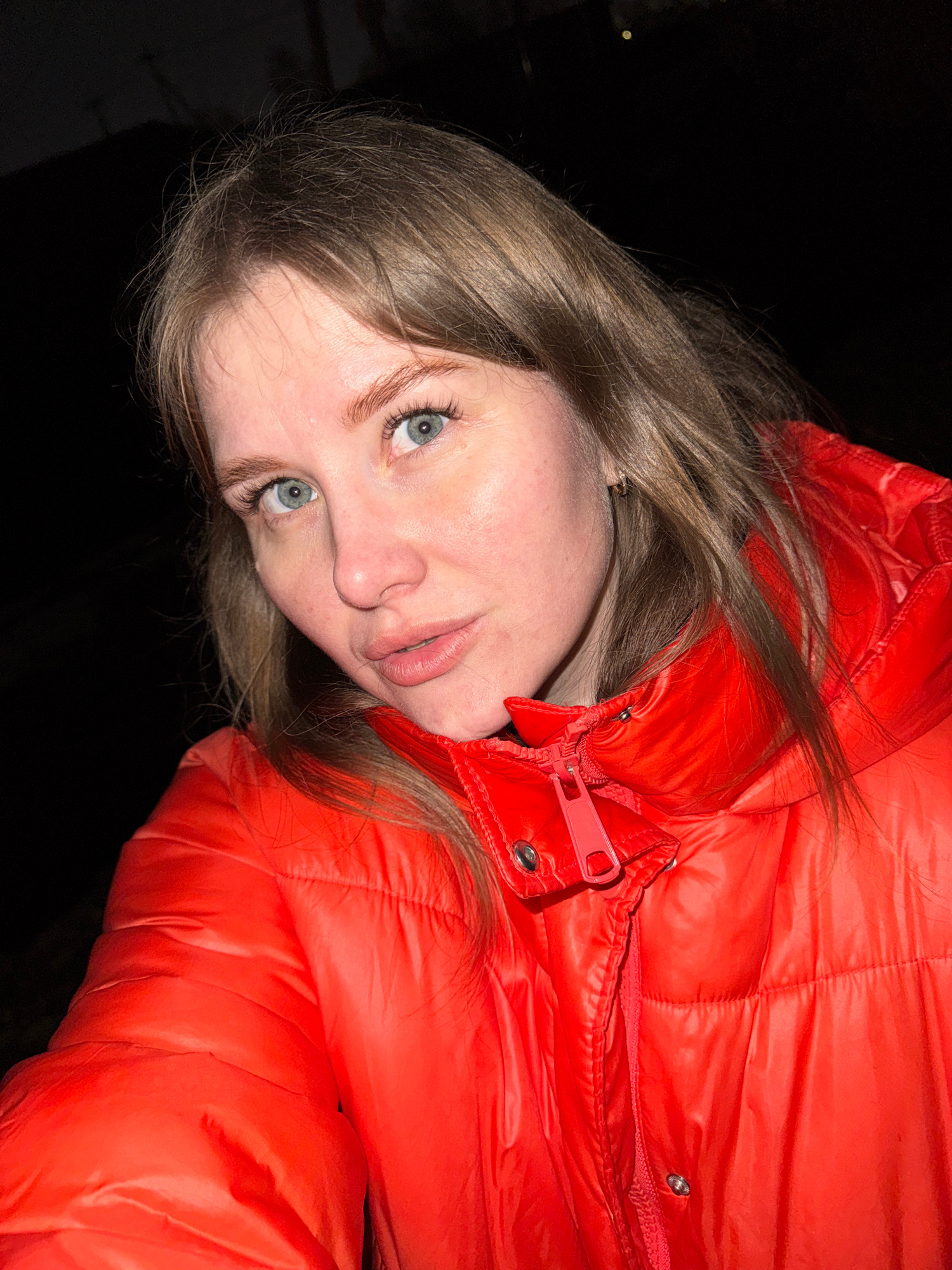 A young woman with fair skin, light brown hair, and blue eyes is wearing a bright orange puffer jacket. The jacket is zipped up to her neck. The background is predominantly black, suggesting a nightti…read more