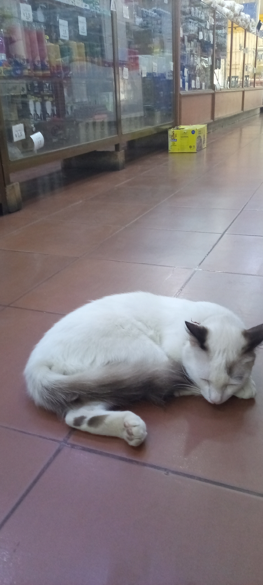 A Siamese cat is lying on a brown tiled floor in an indoor location. Display cases filled with various items are visible in the background. A yellow box is on the floor behind the cat and in front of…read more